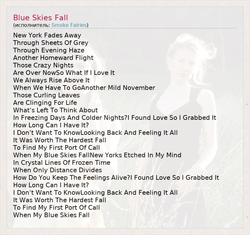 New York Fades Away Through Sheets Of Grey Through Evening Haze Another Homeward Flight Those Crazy Nights Are Over NowSo What If I Love It We Always Rise Above It When We Have To GoAnother Mild November Those Curling Leaves Are Clinging For Life What's Left To Think About In Freezing Days And Colder Nights?I Found Love So I Grabbed It How Long Can I Have It? I Don't Want To KnowLooking Back And Feeling It All It Was Worth The Hardest Fall To Find My First Port Of Call When My Blue Skies FallNew Yorks Etched In My Mind In Crystal Lines Of Frozen Time When Only Distance Divides How Do You Keep The Feelings Alive?I Found Love So I Grabbed It How Long Can I Have It? I Don't Want To KnowLooking Back And Feeling It All It Was Worth The Hardest Fall To Find My First Port Of Call When My Blue Skies Fall