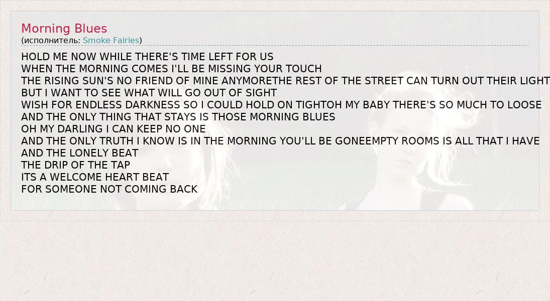 HOLD ME NOW WHILE THERE'S TIME LEFT FOR US WHEN THE MORNING COMES I'LL BE MISSING YOUR TOUCH THE RISING SUN'S NO FRIEND OF MINE ANYMORETHE REST OF THE STREET CAN TURN OUT THEIR LIGHT BUT I WANT TO SEE WHAT WILL GO OUT OF SIGHT WISH FOR ENDLESS DARKNESS SO I COULD HOLD ON TIGHTOH MY BABY THERE'S SO MUCH TO LOOSE AND THE ONLY THING THAT STAYS IS THOSE MORNING BLUES OH MY DARLING I CAN KEEP NO ONE AND THE ONLY TRUTH I KNOW IS IN THE MORNING YOU'LL BE GONEEMPTY ROOMS IS ALL THAT I HAVE AND THE LONELY BEAT THE DRIP OF THE TAP ITS A WELCOME HEART BEAT FOR SOMEONE NOT COMING BACK