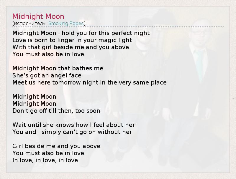 Midnight Moon I hold you for this perfect night Love is born to linger in your magic light With that girl beside me and you above You must also be in love Midnight Moon that bathes me She's got an angel face Meet us here tomorrow night in the very same place Midnight Moon Midnight Moon Don't go off till then, too soon Wait until she knows how I feel about her You and I simply can't go on without her Girl beside me and you above You must also be in love In love, in love, in love