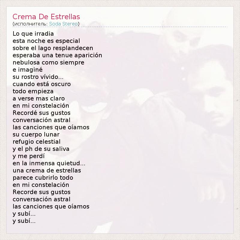 Lo Que irradia Эста Noche эс особенно Sobre El Lago resplandecen Esperaba уна Tenue aparición nebulosa Комо Siempre э Представьте су ростро Vivido ... Cuando está Oscuro TODO empieza стих Рождество Claro ан миль constelación Рекорд Sus Gustos conversación астральное лас Canciones Que oíamos су Cuerpo лунный Refugio небесное у эль тел де су слюны у меня perdí ан ла inmensa quietud ... уна крема де Estrellas Parece cubrirlo TODO ан миль constelación Рекорд Sus Gustos conversación астральное лас Canciones Que oíamos у ЮУрИБФ ... у ЮУрИБФ ...