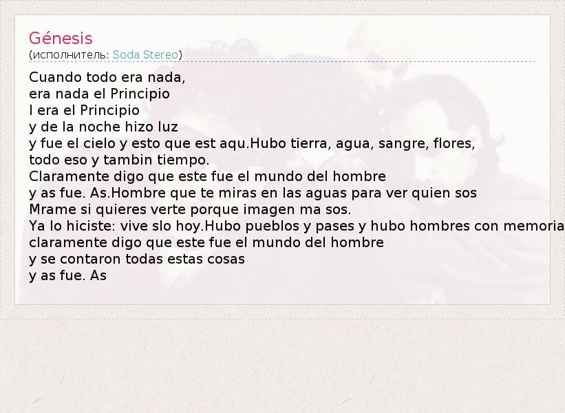 Это интересно:Сода Стерео "Soda Stereo" - аргентинская рок-группа, образовавшаяся в Буэнос-Айресе в 1982 году. Состав - Gustavo Cerati - Густаво Серати (гитара и вокал), Héctor "Zeta" Босио (бас) и Карлос Альберто Фисикчиа (Чарли Альберти, барабанщик). Она считается одной из самых важных в истории ибероамериканского рока. В 1997 группа распалась из-за личных проблем и из-за творческих разногласий. В конце... продолжение
