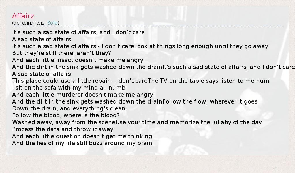 It's such a sad state of affairs, and I don't care A sad state of affairs It's such a sad state of affairs - I don't careLook at things long enough until they go away But they're still there, aren't they? And each little insect doesn't make me angry And the dirt in the sink gets washed down the drainIt's such a sad state of affairs, and I don't care A sad state of affairs This place could use a little repair - I don't careThe TV on the table says listen to me hum I sit on the sofa with my mind all numb And each little murderer doesn't make me angry And the dirt in the sink gets washed down the drainFollow the flow, wherever it goes Down the drain, and everything's clean Follow the blood, where is the blood? Washed away, away from the sceneUse your time and memorize the lullaby of the day Process the data and throw it away And each little question doesn't get me thinking And the lies of my life still buzz around my brain