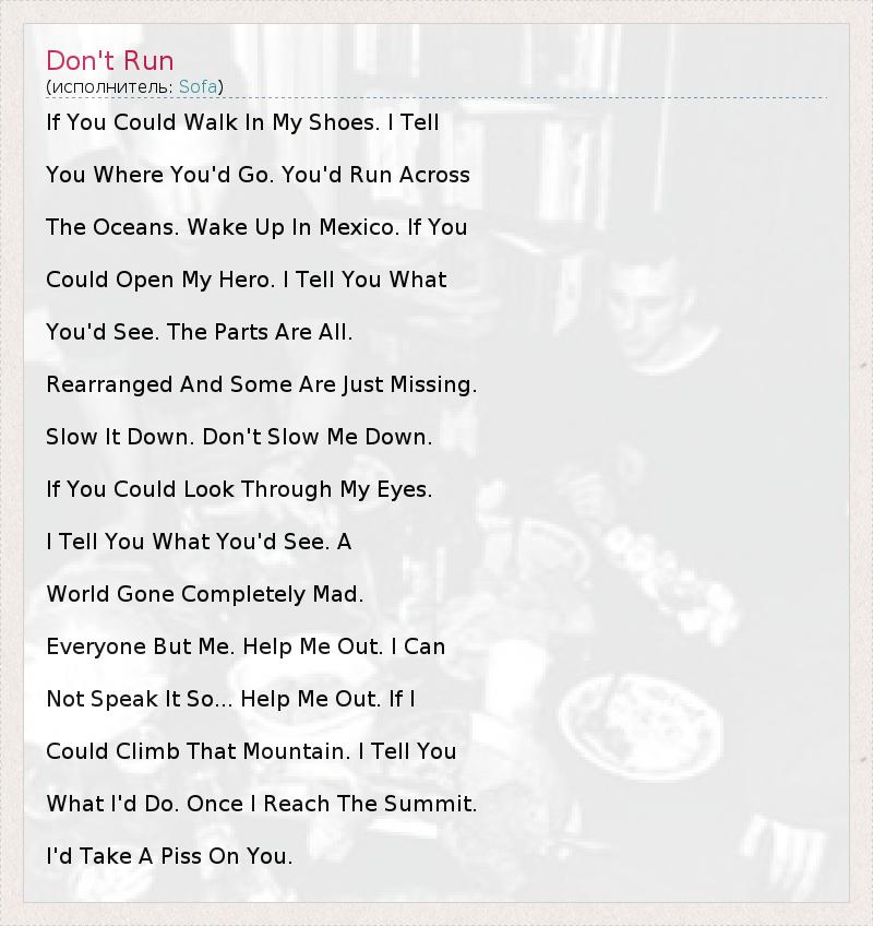 If You Could Walk In My Shoes. I Tell You Where You'd Go. You'd Run Across The Oceans. Wake Up In Mexico. If You Could Open My Hero. I Tell You What You'd See. The Parts Are All. Rearranged And Some Are Just Missing. Slow It Down. Don't Slow Me Down. If You Could Look Through My Eyes. I Tell You What You'd See. A World Gone Completely Mad. Everyone But Me. Help Me Out. I Can Not Speak It So... Help Me Out. If I Could Climb That Mountain. I Tell You What I'd Do. Once I Reach The Summit. I'd Take A Piss On You.