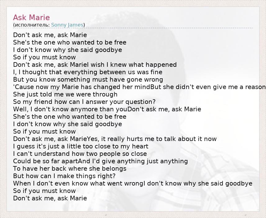 Don't ask me, ask Marie She's the one who wanted to be free I don't know why she said goodbye So if you must know Don't ask me, ask MarieI wish I knew what happened I, I thought that everything between us was fine But you know something must have gone wrong 'Cause now my Marie has changed her mindBut she didn't even give me a reason She just told me we were through So my friend how can I answer your question? Well, I don't know anymore than youDon't ask me, ask Marie She's the one who wanted to be free I don't know why she said goodbye So if you must know Don't ask me, ask MarieYes, it really hurts me to talk about it now I guess it's just a little too close to my heart I can't understand how two people so close Could be so far apartAnd I'd give anything just anything To have her back where she belongs But how can I make things right? When I don't even know what went wrongI don't know why she said goodbye So if you must know Don't ask me, ask Marie
