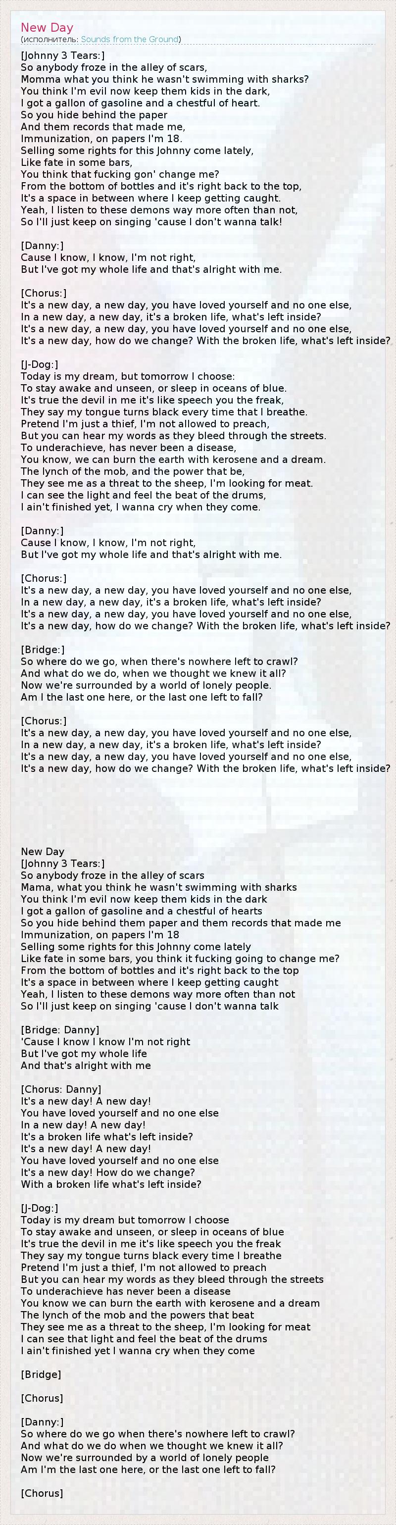 [Johnny 3 Tears:] Кто-то застыл в кровавом переулке, Мама, как думаешь, он не рискует? Ты думаешь, я сейчас злой, держи детей подальше, У меня есть галлон бензина и сердце в груди, Поэтому ты прячешься за моими заметками И записями, которые создали меня - 1 Это твой иммунитет. В этих строчках мне вновь 18, Недавно Джонни решил продать на них права. 2 Как судьба, что может настигнуть в баре, Думаешь, это, бл**ь, меня изменит? Со дна бутылки - и прямо на самую вершину, Но я вновь был застрял где-то посередине. Да, я прислушиваюсь к этим демонам всё чаще, Поэтому я продолжу петь, ведь я не хочу говорить! [Danny:] Ведь я знаю, я знаю, что я неправ, Но у меня впереди целая жизнь - что ж, тем лучше! [Припев:] Это новый день, новый день, ты любил себя и больше никого, В новом дне, новом дне, эта разбитая жизнь, что от нее осталось? Это новый день, новый день, ты любил себя и больше никого, Это новый день, как мы можем измениться? С разбитой жизнью, что от нее осталось? [J-Dog:] Сегодня я мечтаю, но завтра должен выбирать: Оставаться бодрым и незаметным, или спать на дне голубого океана. Во мне правда сидит демон, когда я говорю: "Ты, урод!" Говорят, что я задыхаюсь 3 каждый раз, когда дышу. Представь, что я просто вор, мне не разрешили проповедовать, Но ты можешь услышать мои слова, они кровоточат по улицам. Причина того, что у тебя не получается, не в болезни. Знаешь, мы можем сжечь землю, нужен лишь керосин и мечта. Властная толпа-линчеватель Видит во мне угрозу для овец, я жажду вражды. 4 Я вижу свет и слышу стук барабанов, Я еще не закончил, я хочу заплакать, когда они вернутся. [Danny:] Ведь я знаю, я знаю, что я неправ, Но у меня впереди целая жизнь - что ж, тем лучше! [Припев:] Это новый день, новый день, ты любил себя и больше никого, В новом дне, новом дне, эта разбитая жизнь, что от нее осталось? Это новый день, новый день, ты любил себя и больше никого, Это новый день, как мы можем измениться? С разбитой жизнью, что от нее осталось? [Переход:] Куда нам идти, когда некуда ползти?! Что нам делать, если думали, что в курсе всего? Теперь мы окружены миром одиноких людей. Я последний здесь или последний, оставшийся умирать? [Припев:] Это новый день, новый день, ты любил себя и больше никого, В новом дне, новом дне, эта разбитая жизнь, что от нее осталось? Это новый день, новый день, ты любил себя и больше никого, Это новый день, как мы можем измениться? С разбитой жизнью, что от нее осталось? 1 - Джонни взял галлон бензина и грозится спалить дом, а его мама, чтобы не допустить трагедии, хочет первым делом бросить в огонь самое дорогое для него - наработки, с которых начался его творческий путь 2 - на строчки 3 - дословно: что мой язык чернеет 4 - дословно: я ищу мясо. Meat (мясо) - синоним beef (говядина; а в сленге - вражда) Новый день (перевод Вес из Антрацита) [Куплет 1: Johnny 3 Tears] Кто-то застыл в кровавом переулке, Мама, как думаешь, он не рискует? Ты думаешь, я сейчас злой, держи детей подальше, У меня галлон бензина и я полон чувств, Поэтому ты прячешь мои записи и песни от них, Предостерегаешь, на записях мне 18. Продавая некоторые права, Джонни оказался последним, Подобно судьбе в некоторых строчках. Черт возьми, думаешь, меня это изменит? 5 От пьянства и опять к началу, Это пространство, в котором я застрял. Дааа, я слушаю этих демонов гораздо чаще, чем нет, Поэтому я буду просто продолжать петь, потому что не хочу говорить. 6 [Переход: Danny] Потому что я п