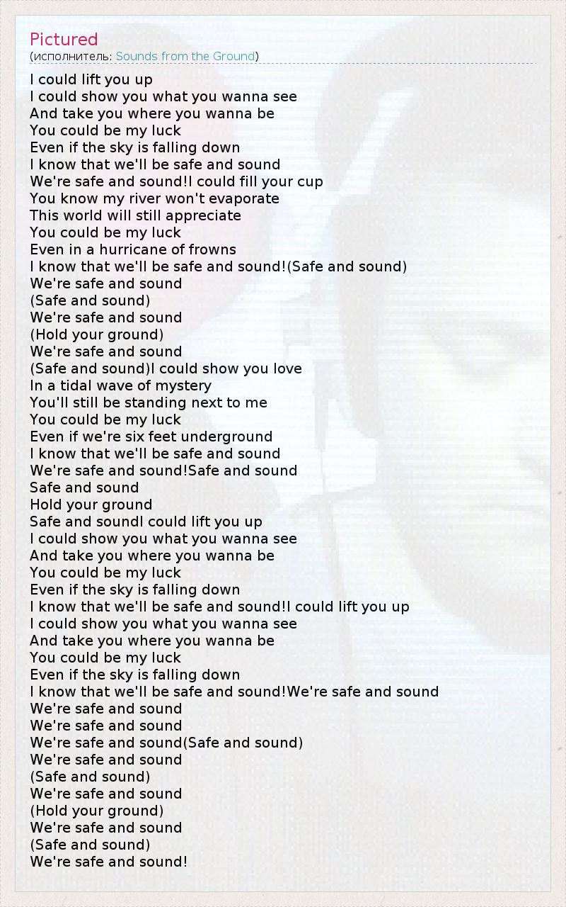 I could lift you up I could show you what you wanna see And take you where you wanna be You could be my luck Even if the sky is falling down I know that we'll be safe and sound We're safe and sound!I could fill your cup You know my river won't evaporate This world will still appreciate You could be my luck Even in a hurricane of frowns I know that we'll be safe and sound!(Safe and sound) We're safe and sound (Safe and sound) We're safe and sound (Hold your ground) We're safe and sound (Safe and sound)I could show you love In a tidal wave of mystery You'll still be standing next to me You could be my luck Even if we're six feet underground I know that we'll be safe and sound We're safe and sound!Safe and sound Safe and sound Hold your ground Safe and soundI could lift you up I could show you what you wanna see And take you where you wanna be You could be my luck Even if the sky is falling down I know that we'll be safe and sound!I could lift you up I could show you what you wanna see And take you where you wanna be You could be my luck Even if the sky is falling down I know that we'll be safe and sound!We're safe and sound We're safe and sound We're safe and sound We're safe and sound(Safe and sound) We're safe and sound (Safe and sound) We're safe and sound (Hold your ground) We're safe and sound (Safe and sound) We're safe and sound!