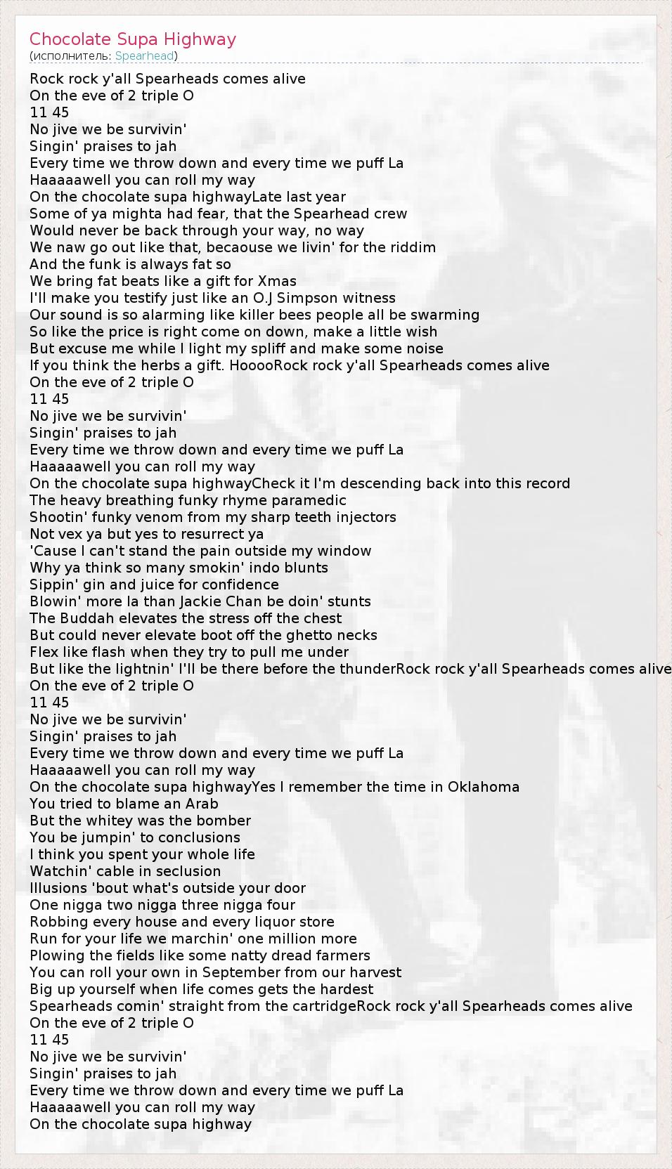 Rock rock y'all Spearheads comes alive On the eve of 2 triple O 11 45 No jive we be survivin' Singin' praises to jah Every time we throw down and every time we puff La Haaaaawell you can roll my way On the chocolate supa highwayLate last year Some of ya mighta had fear, that the Spearhead crew Would never be back through your way, no way We naw go out like that, becaouse we livin' for the riddim And the funk is always fat so We bring fat beats like a gift for Xmas I'll make you testify just like an O.J Simpson witness Our sound is so alarming like killer bees people all be swarming So like the price is right come on down, make a little wish But excuse me while I light my spliff and make some noise If you think the herbs a gift. HooooRock rock y'all Spearheads comes alive On the eve of 2 triple O 11 45 No jive we be survivin' Singin' praises to jah Every time we throw down and every time we puff La Haaaaawell you can roll my way On the chocolate supa highwayCheck it I'm descending back into this record The heavy breathing funky rhyme paramedic Shootin' funky venom from my sharp teeth injectors Not vex ya but yes to resurrect ya 'Cause I can't stand the pain outside my window Why ya think so many smokin' indo blunts Sippin' gin and juice for confidence Blowin' more la than Jackie Chan be doin' stunts The Buddah elevates the stress off the chest But could never elevate boot off the ghetto necks Flex like flash when they try to pull me under But like the lightnin' I'll be there before the thunderRock rock y'all Spearheads comes alive On the eve of 2 triple O 11 45 No jive we be survivin' Singin' praises to jah Every time we throw down and every time we puff La Haaaaawell you can roll my way On the chocolate supa highwayYes I remember the time in Oklahoma You tried to blame an Arab But the whitey was the bomber You be jumpin' to conclusions I think you spent your whole life Watchin' cable in seclusion Illusions 'bout what's outside your door One nigga two nigga three nigga four Robbing every house and every liquor store Run for your life we marchin' one million more Plowing the fields like some natty dread farmers You can roll your own in September from our harvest Big up yourself when life comes gets the hardest Spearheads comin' straight from the cartridgeRock rock y'all Spearheads comes alive On the eve of 2 triple O 11 45 No jive we be survivin' Singin' praises to jah Every time we throw down and every time we puff La Haaaaawell you can roll my way On the chocolate supa highway