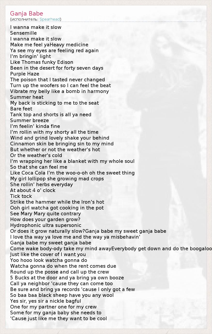 I wanna make it slow Sensemille I wanna make it slow Make me feel yaHeavy medicine Ya see my eyes are feeling red again I'm bringin' light Like Thomas funky Edison Been in the desert for forty seven days Purple Haze The poison that I tasted never changed Turn up the woofers so I can feel the beat Vibrate my belly like a bomb in harmony Summer heat My back is sticking to me to the seat Bare feet Tank top and shorts is all ya need Summer breeze I'm feelin' kinda fine I'm rollin with my shorty all the time Wind and grind lovely shake your behind Cinnamon skin be bringing sin to my mind But whether or not the weather's hot Or the weather's cold I'm wrapping her like a blanket with my whole soul So that she can feel me Like Coca Cola I'm the woo-o-oh oh the sweet thing My girl lollipop she growing mad crops She rollin' herbs everyday At about 4 o' clock Tick tock Strike the hammer while the Iron's hot Ooh girl watcha got cooking in the pot See Mary Mary quite contrary How does your garden grow? Hydrophonic ultra supersonic Or does it grow naturally slow?Ganja babe my sweet ganja babe I love tha way ya love me and the way ya misbehavin' Ganja babe my sweet ganja babe Come wake body-ody take my mind awayEverybody get down and do the boogaloo Just like the cover of I want you Yoo hooo look watcha gonna do Watcha gonna do when the rent comes due Round up the posse and call up the crew 5 Bucks at the door and ya bring ya own booze Call ya neighbor 'cause they can come too Be sure and bring ya records 'cause I only got a few So baa baa black sheep have you any wool Yes sir, yes sir a nickle bagful One for my partner one for my crew Some for my ganja baby she needs to 'Cause just like me they want to be cool