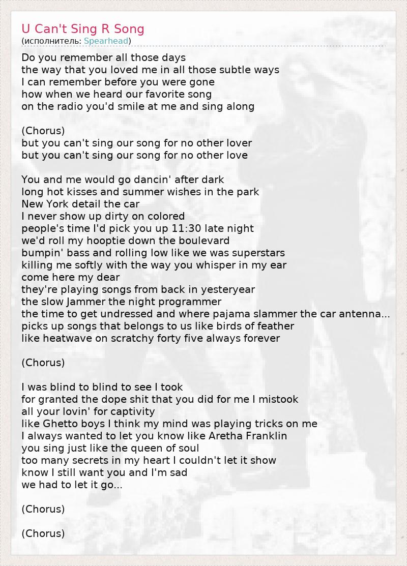 Do you remember all those days the way that you loved me in all those subtle ways I can remember before you were gone how when we heard our favorite song on the radio you'd smile at me and sing along (Chorus) but you can't sing our song for no other lover but you can't sing our song for no other love You and me would go dancin' after dark long hot kisses and summer wishes in the park New York detail the car I never show up dirty on colored people's time I'd pick you up 11:30 late night we'd roll my hooptie down the boulevard bumpin' bass and rolling low like we was superstars killing me softly with the way you whisper in my ear come here my dear they're playing songs from back in yesteryear the slow Jammer the night programmer the time to get undressed and where pajama slammer the car antenna... picks up songs that belongs to us like birds of feather like heatwave on scratchy forty five always forever (Chorus) I was blind to blind to see I took for granted the dope shit that you did for me I mistook all your lovin' for captivity like Ghetto boys I think my mind was playing tricks on me I always wanted to let you know like Aretha Franklin you sing just like the queen of soul too many secrets in my heart I couldn't let it show know I still want you and I'm sad we had to let it go... (Chorus) (Chorus)