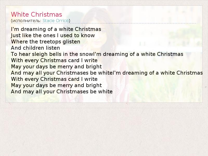 I'm dreaming of a white Christmas Just like the ones I used to know Where the treetops glisten And children listen To hear sleigh bells in the snowI'm dreaming of a white Christmas With every Christmas card I write May your days be merry and bright And may all your Christmases be whiteI'm dreaming of a white Christmas With every Christmas card I write May your days be merry and bright And may all your Christmases be white
