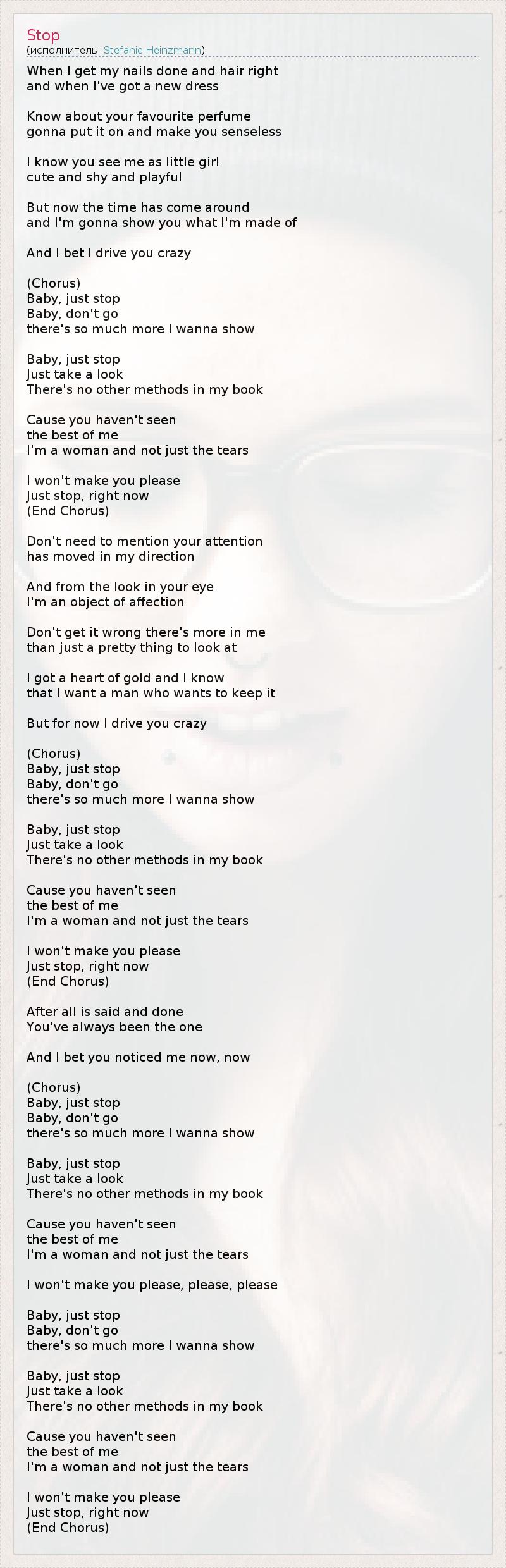 When I get my nails done and hair right and when I've got a new dress Know about your favourite perfume gonna put it on and make you senseless I know you see me as little girl cute and shy and playful But now the time has come around and I'm gonna show you what I'm made of And I bet I drive you crazy (Chorus) Baby, just stop Baby, don't go there's so much more I wanna show Baby, just stop Just take a look There's no other methods in my book Cause you haven't seen the best of me I'm a woman and not just the tears I won't make you please Just stop, right now (End Chorus) Don't need to mention your attention has moved in my direction And from the look in your eye I'm an object of affection Don't get it wrong there's more in me than just a pretty thing to look at I got a heart of gold and I know that I want a man who wants to keep it But for now I drive you crazy (Chorus) Baby, just stop Baby, don't go there's so much more I wanna show Baby, just stop Just take a look There's no other methods in my book Cause you haven't seen the best of me I'm a woman and not just the tears I won't make you please Just stop, right now (End Chorus) After all is said and done You've always been the one And I bet you noticed me now, now (Chorus) Baby, just stop Baby, don't go there's so much more I wanna show Baby, just stop Just take a look There's no other methods in my book Cause you haven't seen the best of me I'm a woman and not just the tears I won't make you please, please, please Baby, just stop Baby, don't go there's so much more I wanna show Baby, just stop Just take a look There's no other methods in my book Cause you haven't seen the best of me I'm a woman and not just the tears I won't make you please Just stop, right now (End Chorus)