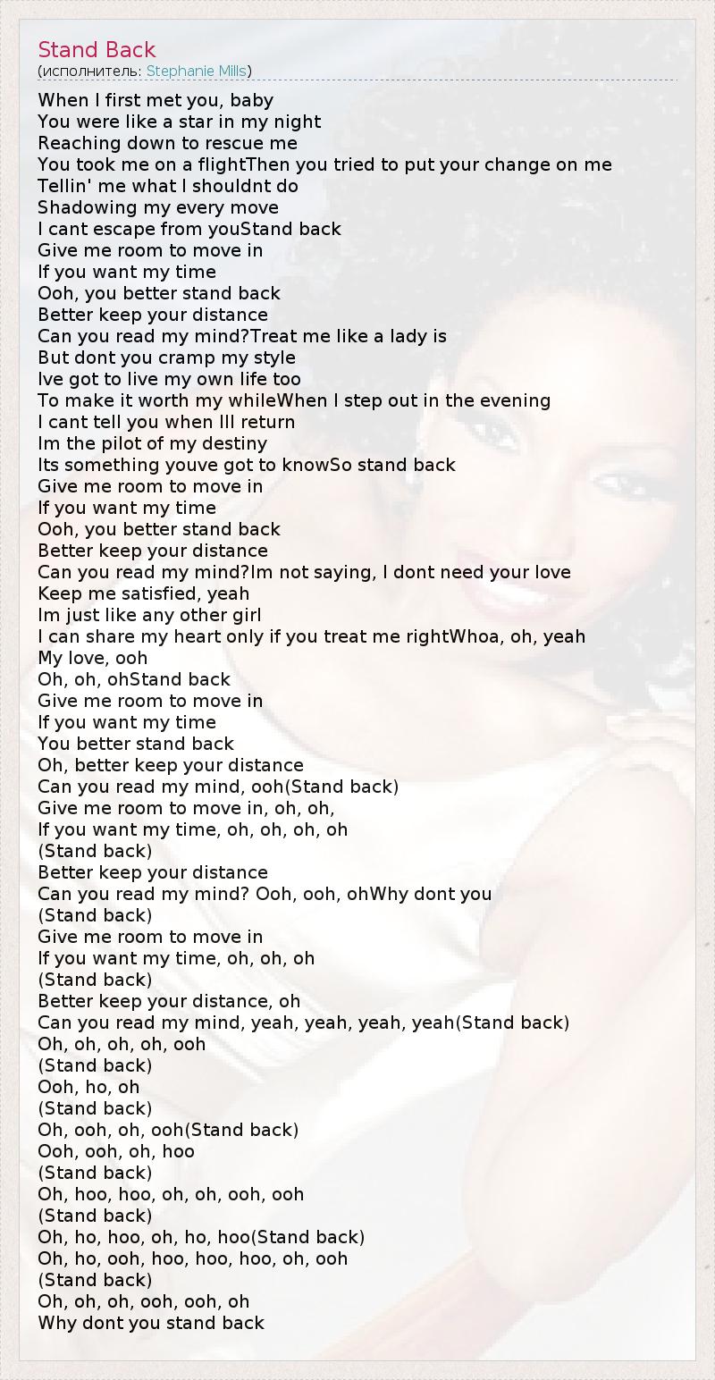 When I first met you, baby You were like a star in my night Reaching down to rescue me You took me on a flightThen you tried to put your change on me Tellin' me what I shouldnt do Shadowing my every move I cant escape from youStand back Give me room to move in If you want my time Ooh, you better stand back Better keep your distance Can you read my mind?Treat me like a lady is But dont you cramp my style Ive got to live my own life too To make it worth my whileWhen I step out in the evening I cant tell you when Ill return Im the pilot of my destiny Its something youve got to knowSo stand back Give me room to move in If you want my time Ooh, you better stand back Better keep your distance Can you read my mind?Im not saying, I dont need your love Keep me satisfied, yeah Im just like any other girl I can share my heart only if you treat me rightWhoa, oh, yeah My love, ooh Oh, oh, ohStand back Give me room to move in If you want my time You better stand back Oh, better keep your distance Can you read my mind, ooh(Stand back) Give me room to move in, oh, oh, If you want my time, oh, oh, oh, oh (Stand back) Better keep your distance Can you read my mind? Ooh, ooh, ohWhy dont you (Stand back) Give me room to move in If you want my time, oh, oh, oh (Stand back) Better keep your distance, oh Can you read my mind, yeah, yeah, yeah, yeah(Stand back) Oh, oh, oh, oh, ooh (Stand back) Ooh, ho, oh (Stand back) Oh, ooh, oh, ooh(Stand back) Ooh, ooh, oh, hoo (Stand back) Oh, hoo, hoo, oh, oh, ooh, ooh (Stand back) Oh, ho, hoo, oh, ho, hoo(Stand back) Oh, ho, ooh, hoo, hoo, hoo, oh, ooh (Stand back) Oh, oh, oh, ooh, ooh, oh Why dont you stand back