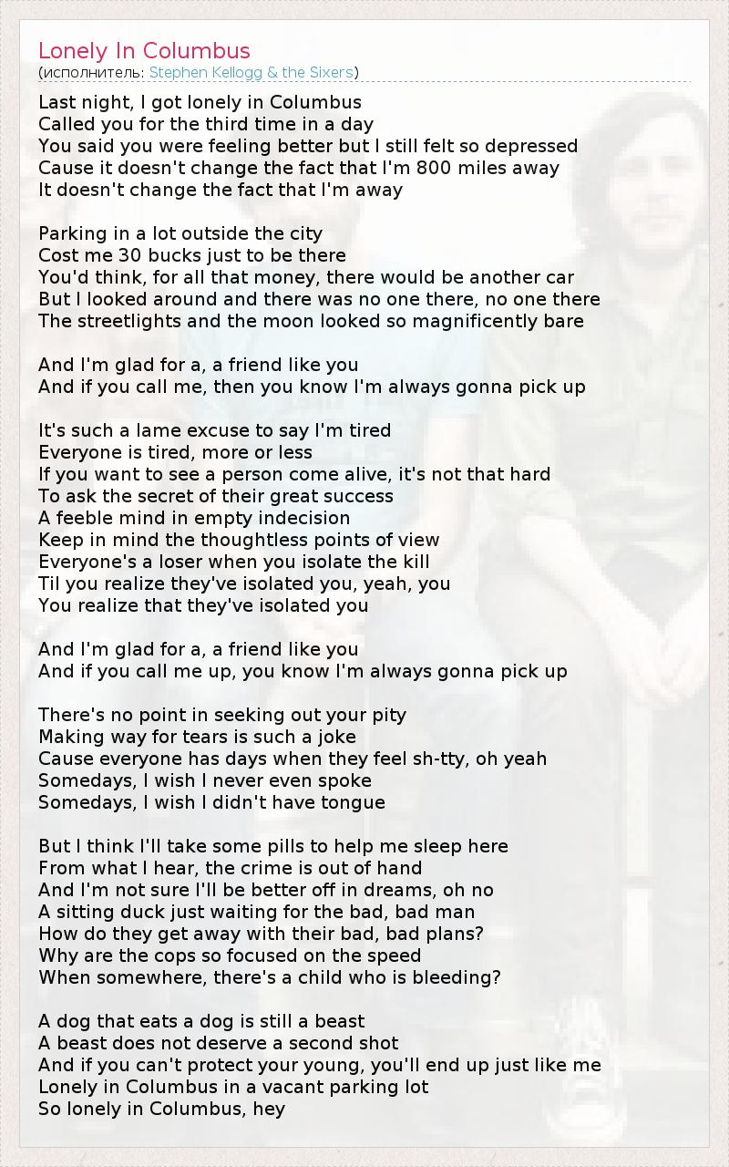 Last night, I got lonely in Columbus Called you for the third time in a day You said you were feeling better but I still felt so depressed Cause it doesn't change the fact that I'm 800 miles away It doesn't change the fact that I'm away Parking in a lot outside the city Cost me 30 bucks just to be there You'd think, for all that money, there would be another car But I looked around and there was no one there, no one there The streetlights and the moon looked so magnificently bare And I'm glad for a, a friend like you And if you call me, then you know I'm always gonna pick up It's such a lame excuse to say I'm tired Everyone is tired, more or less If you want to see a person come alive, it's not that hard To ask the secret of their great success A feeble mind in empty indecision Keep in mind the thoughtless points of view Everyone's a loser when you isolate the kill Til you realize they've isolated you, yeah, you You realize that they've isolated you And I'm glad for a, a friend like you And if you call me up, you know I'm always gonna pick up There's no point in seeking out your pity Making way for tears is such a joke Cause everyone has days when they feel sh-tty, oh yeah Somedays, I wish I never even spoke Somedays, I wish I didn't have tongue But I think I'll take some pills to help me sleep here From what I hear, the crime is out of hand And I'm not sure I'll be better off in dreams, oh no A sitting duck just waiting for the bad, bad man How do they get away with their bad, bad plans? Why are the cops so focused on the speed When somewhere, there's a child who is bleeding? A dog that eats a dog is still a beast A beast does not deserve a second shot And if you can't protect your young, you'll end up just like me Lonely in Columbus in a vacant parking lot So lonely in Columbus, hey
