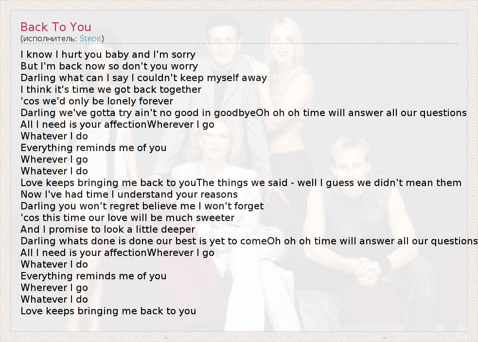 I know I hurt you baby and I'm sorry But I'm back now so don't you worry Darling what can I say I couldn't keep myself away I think it's time we got back together 'cos we'd only be lonely forever Darling we've gotta try ain't no good in goodbyeOh oh oh time will answer all our questions All I need is your affectionWherever I go Whatever I do Everything reminds me of you Wherever I go Whatever I do Love keeps bringing me back to youThe things we said - well I guess we didn't mean them Now I've had time I understand your reasons Darling you won't regret believe me I won't forget 'cos this time our love will be much sweeter And I promise to look a little deeper Darling whats done is done our best is yet to comeOh oh oh time will answer all our questions All I need is your affectionWherever I go Whatever I do Everything reminds me of you Wherever I go Whatever I do Love keeps bringing me back to you