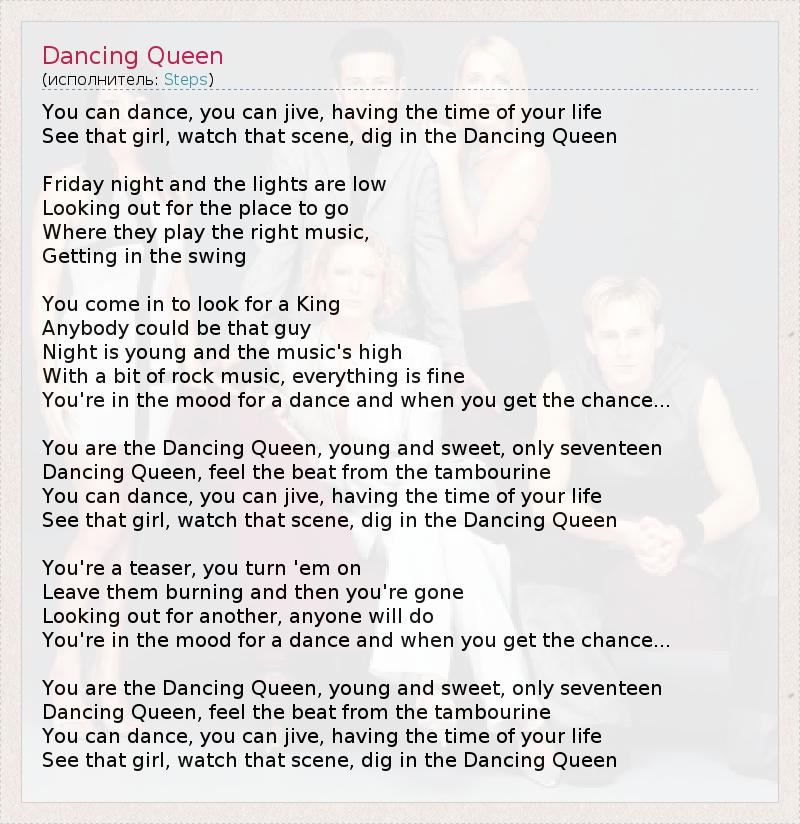You can dance, you can jive, having the time of your life See that girl, watch that scene, dig in the Dancing Queen Friday night and the lights are low Looking out for the place to go Where they play the right music, Getting in the swing You come in to look for a King Anybody could be that guy Night is young and the music's high With a bit of rock music, everything is fine You're in the mood for a dance and when you get the chance... You are the Dancing Queen, young and sweet, only seventeen Dancing Queen, feel the beat from the tambourine You can dance, you can jive, having the time of your life See that girl, watch that scene, dig in the Dancing Queen You're a teaser, you turn 'em on Leave them burning and then you're gone Looking out for another, anyone will do You're in the mood for a dance and when you get the chance... You are the Dancing Queen, young and sweet, only seventeen Dancing Queen, feel the beat from the tambourine You can dance, you can jive, having the time of your life See that girl, watch that scene, dig in the Dancing Queen