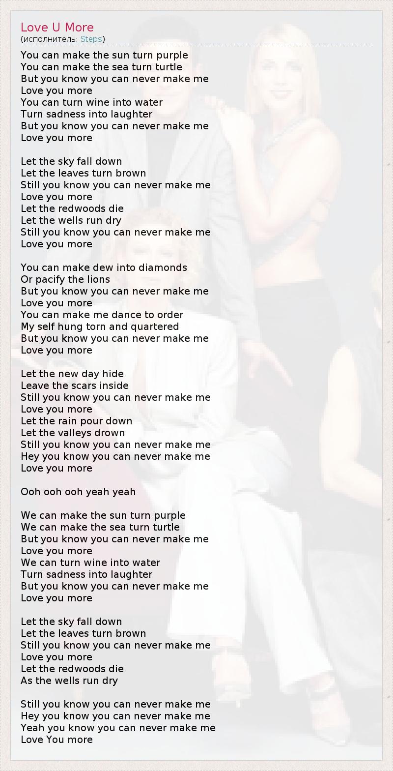 You can make the sun turn purple You can make the sea turn turtle But you know you can never make me Love you more You can turn wine into water Turn sadness into laughter But you know you can never make me Love you more Let the sky fall down Let the leaves turn brown Still you know you can never make me Love you more Let the redwoods die Let the wells run dry Still you know you can never make me Love you more You can make dew into diamonds Or pacify the lions But you know you can never make me Love you more You can make me dance to order My self hung torn and quartered But you know you can never make me Love you more Let the new day hide Leave the scars inside Still you know you can never make me Love you more Let the rain pour down Let the valleys drown Still you know you can never make me Hey you know you can never make me Love you more Ooh ooh ooh yeah yeah We can make the sun turn purple We can make the sea turn turtle But you know you can never make me Love you more We can turn wine into water Turn sadness into laughter But you know you can never make me Love you more Let the sky fall down Let the leaves turn brown Still you know you can never make me Love you more Let the redwoods die As the wells run dry Still you know you can never make me Hey you know you can never make me Yeah you know you can never make me Love You more