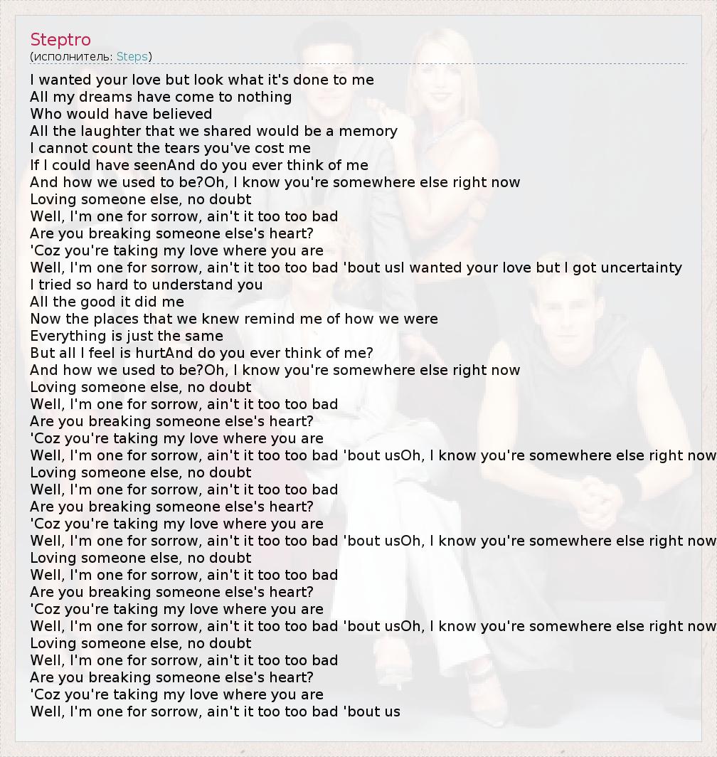 Это интересно:Группа «Steps» была сформирована в 1997 году Лондоне, Великобритания. Она была одним из самых популярных британских музыкальных поп коллективов. Группу можно назвать коммерческим проектом, за время своего существования команда продала более 25 миллионов дисков, около 15 миллионов было продано за границей.Группа «Steps» была создана менеджером Тимом Бироном, Барри Аптоном и Стивом Кросби.... продолжение