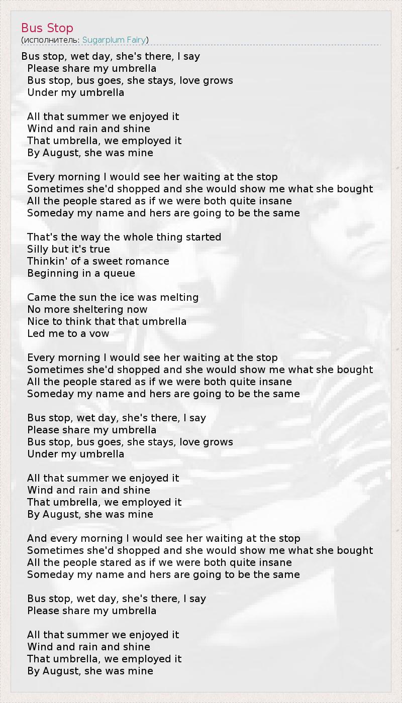 Bus stop, wet day, she's there, I say Please share my umbrella Bus stop, bus goes, she stays, love grows Under my umbrella All that summer we enjoyed it Wind and rain and shine That umbrella, we employed it By August, she was mine Every morning I would see her waiting at the stop Sometimes she'd shopped and she would show me what she bought All the people stared as if we were both quite insane Someday my name and hers are going to be the same That's the way the whole thing started Silly but it's true Thinkin' of a sweet romance Beginning in a queue Came the sun the ice was melting No more sheltering now Nice to think that that umbrella Led me to a vow Every morning I would see her waiting at the stop Sometimes she'd shopped and she would show me what she bought All the people stared as if we were both quite insane Someday my name and hers are going to be the same Bus stop, wet day, she's there, I say Please share my umbrella Bus stop, bus goes, she stays, love grows Under my umbrella All that summer we enjoyed it Wind and rain and shine That umbrella, we employed it By August, she was mine And every morning I would see her waiting at the stop Sometimes she'd shopped and she would show me what she bought All the people stared as if we were both quite insane Someday my name and hers are going to be the same Bus stop, wet day, she's there, I say Please share my umbrella All that summer we enjoyed it Wind and rain and shine That umbrella, we employed it By August, she was mine
