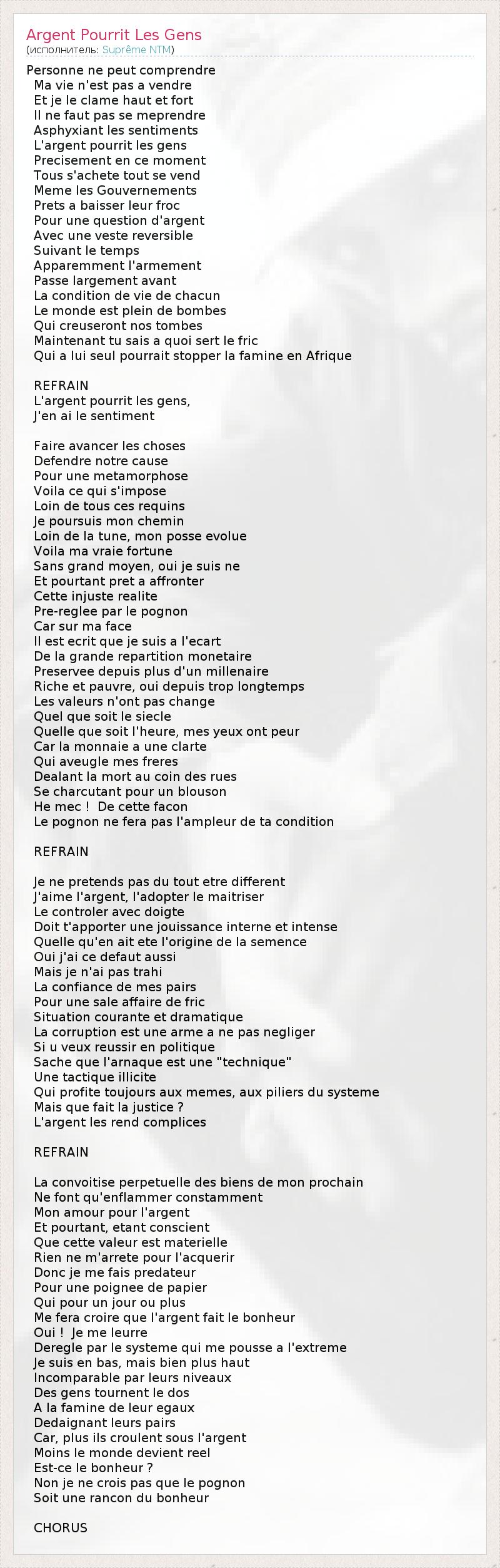 А как ты думаешь, о чем песня "Argent Pourrit Les Gens" ?