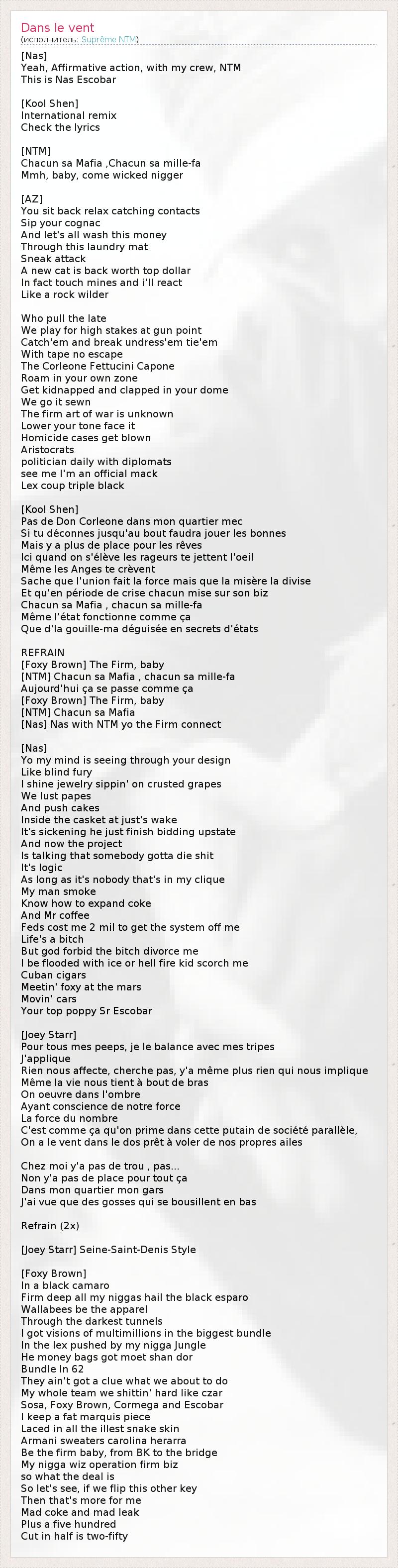 [ Nas ] Да, Позитивные действия , с моего экипажа , NTM Это Nas Escobar [ Kool Shen ] Международный ремикс Проверьте текст [ НТМ ] Chacun са мафии , Chacun са промилле -фа Ммм , детка, давай нечестивых негр [AZ] Вы сидите сложа руки расслабиться ловить контакты Насладиться коньяк И давайте все мыть эти деньги Благодаря этой прачечной мат Скрытность атаки Новый кот вернулся стоит главный доллар На самом деле прикоснуться мины , и я буду реагировать Как рок- Уайлдером Кто тянутьпоздно Мы играем по-крупному под дулом пистолета Catch'em и сломать undress'em tie'em С ленты нет выхода Корлеоне Fettucini Капоне Бродят в вашей собственной зоны Получить похитили и хлопали в вашем куполе Мы идем, это сшитые Фирма искусство войны неизвестно Опустите тон лица он Убийство случаи получить ветром Аристократы Политик ежедневно с дипломатами мне Я официальный Мак Лекс переворот тройной черный [ Kool Shen ] Па-де- Дон Корлеоне данс Пн Quartier MEC Si Tu déconnes jusqu'au бой faudra Jouer ле Bonnes Маис у плюс -де- место залить ле rêves Ici Quand на s'élève ле rageurs те jettent L'законотворчества Même ле Ангелов те crèvent Sache дие L'Union свершившимся ла сила Mais Que ла misère ла divise Et qu'en période де Crise Chacun режиссура сюр сын бизнес Chacun са мафии , Chacun са промилле -фа Même l' переворот fonctionne Comme Ca Que d' ла gouille - ма déguisée ан секретов перевороты ВОЗДЕРЖАТЬСЯ [ Foxy Brown ] Фирма , малыш [ НТМ ] Chacun са мафии , Chacun са промилле -фа Aujourd'hui ça себе устаревшими Comme Ca [ Foxy Brown ] Фирма , малыш [ НТМ ] Chacun са Мафия [ Nas ] Nas с NTM летфирма подключения [ Nas ] Йо мой ум видит через вашего дизайна Как слепой ярости Я сиять ювелирный потягивать на коркой винограда Мы вожделением Пап И нажать торты Внутри шкатулки на Жюста после Это тошнотворный он просто закончить торги Upstate И сейчас проект Является ли говорить , что кто-то должен умереть дерьмо Это логика Пока это никого это в моем клике Мой мужчина дым Знать, как расширить кокс И г-н кофе Федералы стоило мне 2 мил , чтобы получить систему с меня Жизнь сука Но не дай богсука развестись со мной Я быть залита льдом или геенну огненную малыша палить меня кубинские сигары Meetin " Foxy на Марс Movin ' автомобили Ваша главная мака Sr Эскобар [ Joey Starr ] Pour Tous тез выглядывает , JE ле баланса ауес MES Tripes J'applique Ничего ноус affecte , Шерше па , y'a même плюс Rien Квай ноус implique Même ля ви нус tient бой де бра На творчество данс l' Ombre Ayant совесть де Нотр сила La Force дю Nombre C'est Comme Ca qu'on премьер данс Cette Putain де société Параллельная , НаLe Vent данс ле -дус- prêt à Voler де NOS propres Ailes Chez Moi y'a па-де- Тру , па ... Номера y'a па-де- место залить Tout CA Dans пн районных пн Гарс J'ai VUE дие де Gosses Qui SE bousillent ан барельефы Воздержитесь (2x) [ Joey Starr ] Seine-Saint- Denis Стиль [ Foxy Brown ] В черной Camaro Фирма глубокие все мои ниггеры приветствуем черный esparo Wallabees быть одежда Через самых темных туннелях Я получил видения multimillions в самом большом расслоении В Lex толкнул моего ниггер джунглей Он денежные мешки получил Moet шань дор Bundle В 62 Они не получил ключ, что мы собираемся сделать Вся моя команда , мы shittin " тяжело, как царя Соса, Foxy Brown , Cormega и Эскобар Я держу жира маркиза кусок Laced во всем illest змеиной кожи Armani свитера Каролина herarra Будьте фирма ребенок, от BK к мосту Мой ниггер профессионалом операция фирма бизнес так в чем дело Итак, давайте посмотрим , если мы флип эту другую клавишу Тогда это больше для меня Безумный кокса и ума утечка Плюс пятисот Разрезать пополам два - пятьдесят