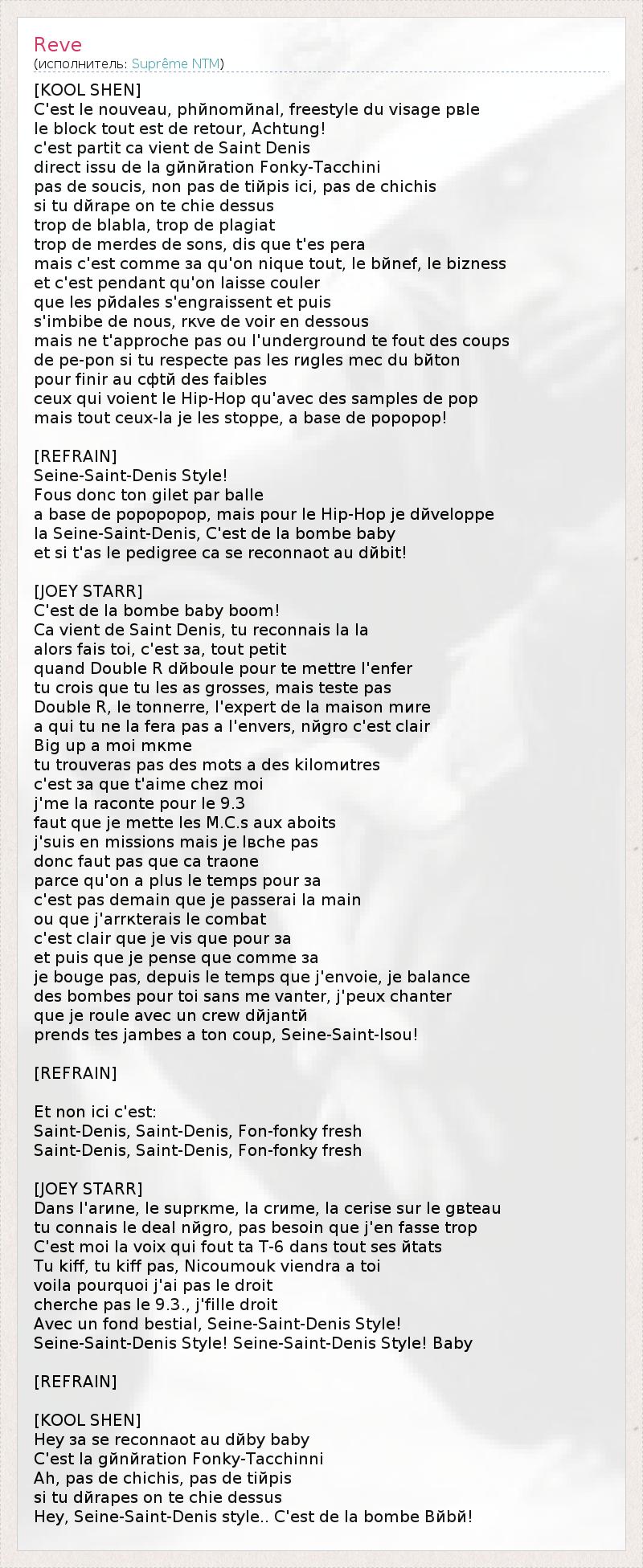 [KOOL SHEN] C'est le nouveau, phйnomйnal, freestyle du visage pвle le block tout est de retour, Achtung! c'est partit ca vient de Saint Denis direct issu de la gйnйration Fonky-Tacchini pas de soucis, non pas de tiйpis ici, pas de chichis si tu dйrape on te chie dessus trop de blabla, trop de plagiat trop de merdes de sons, dis que t'es pera mais c'est comme зa qu'on nique tout, le bйnef, le bizness et c'est pendant qu'on laisse couler que les pйdales s'engraissent et puis s'imbibe de nous, rкve de voir en dessous mais ne t'approche pas ou l'underground te fout des coups de pe-pon si tu respecte pas les rиgles mec du bйton pour finir au cфtй des faibles ceux qui voient le Hip-Hop qu'avec des samples de pop mais tout ceux-lа je les stoppe, a base de popopop! [REFRAIN] Seine-Saint-Denis Style! Fous donc ton gilet par balle а base de popopopop, mais pour le Hip-Hop je dйveloppe la Seine-Saint-Denis, C'est de la bombe baby et si t'as le pedigree ca se reconnaоt au dйbit! [JOEY STARR] C'est de la bombe baby boom! Ca vient de Saint Denis, tu reconnais lа lа alors fais toi, c'est зa, tout petit quand Double R dйboule pour te mettre l'enfer tu crois que tu les as grosses, mais teste pas Double R, le tonnerre, l'expert de la maison mиre а qui tu ne la fera pas а l'envers, nйgro c'est clair Big up a moi mкme tu trouveras pas des mots а des kilomиtres c'est зa que t'aime chez moi j'me la raconte pour le 9.3 faut que je mette les M.C.s aux aboits j'suis en missions mais je lвche pas donc faut pas que ca traоne parce qu'on а plus le temps pour зa c'est pas demain que je passerai la main ou que j'arrкterais le combat c'est clair que je vis que pour зa et puis que je pense que comme зa je bouge pas, depuis le temps que j'envoie, je balance des bombes pour toi sans me vanter, j'peux chanter que je roule avec un crew dйjantй prends tes jambes а ton coup, Seine-Saint-Isou! [REFRAIN] Et non ici c'est: Saint-Denis, Saint-Denis, Fon-fonky fresh Saint-Denis, Saint-Denis, Fon-fonky fresh [JOEY STARR] Dans l'arиne, le suprкme, la crиme, la cerise sur le gвteau tu connais le deal nйgro, pas besoin que j'en fasse trop C'est moi la voix qui fout ta T-6 dans tout ses йtats Tu kiff, tu kiff pas, Nicoumouk viendra а toi voilа pourquoi j'ai pas le droit cherche pas le 9.3., j'fille droit Avec un fond bestial, Seine-Saint-Denis Style! Seine-Saint-Denis Style! Seine-Saint-Denis Style! Baby [REFRAIN] [KOOL SHEN] Hey зa se reconnaоt au dйby baby C'est la gйnйration Fonky-Tacchinni Ah, pas de chichis, pas de tiйpis si tu dйrapes on te chie dessus Hey, Seine-Saint-Denis style.. C'est de la bombe Bйbй!