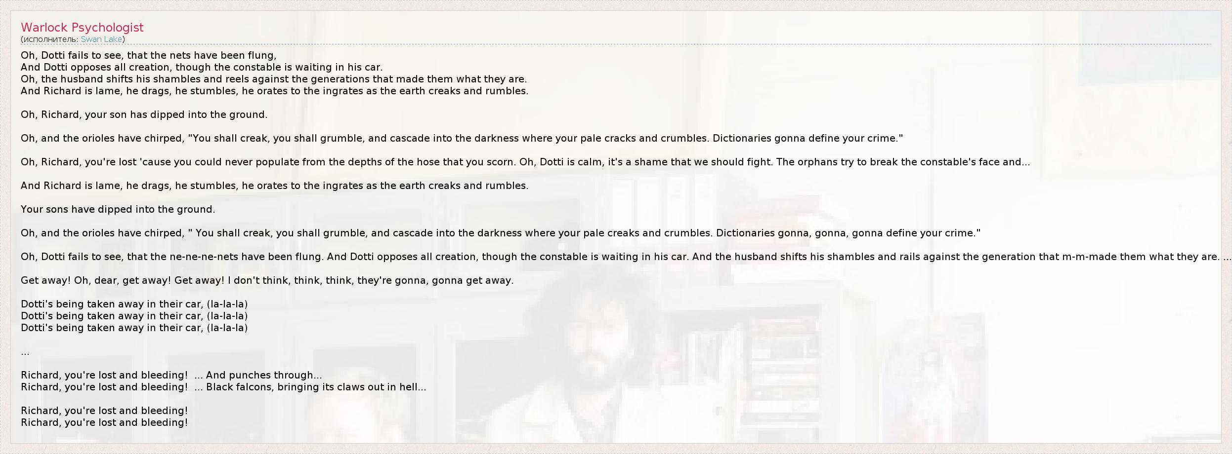 Oh, Dotti fails to see, that the nets have been flung, And Dotti opposes all creation, though the constable is waiting in his car. Oh, the husband shifts his shambles and reels against the generations that made them what they are. And Richard is lame, he drags, he stumbles, he orates to the ingrates as the earth creaks and rumbles. Oh, Richard, your son has dipped into the ground. Oh, and the orioles have chirped, "You shall creak, you shall grumble, and cascade into the darkness where your pale cracks and crumbles. Dictionaries gonna define your crime." Oh, Richard, you're lost 'cause you could never populate from the depths of the hose that you scorn. Oh, Dotti is calm, it's a shame that we should fight. The orphans try to break the constable's face and... And Richard is lame, he drags, he stumbles, he orates to the ingrates as the earth creaks and rumbles. Your sons have dipped into the ground. Oh, and the orioles have chirped, " You shall creak, you shall grumble, and cascade into the darkness where your pale creaks and crumbles. Dictionaries gonna, gonna, gonna define your crime." Oh, Dotti fails to see, that the ne-ne-ne-nets have been flung. And Dotti opposes all creation, though the constable is waiting in his car. And the husband shifts his shambles and rails against the generation that m-m-made them what they are. ... Get away! Oh, dear, get away! Get away! I don't think, think, think, they're gonna, gonna get away. Dotti's being taken away in their car, (la-la-la) Dotti's being taken away in their car, (la-la-la) Dotti's being taken away in their car, (la-la-la) ... Richard, you're lost and bleeding! ... And punches through... Richard, you're lost and bleeding! ... Black falcons, bringing its claws out in hell... Richard, you're lost and bleeding! Richard, you're lost and bleeding!