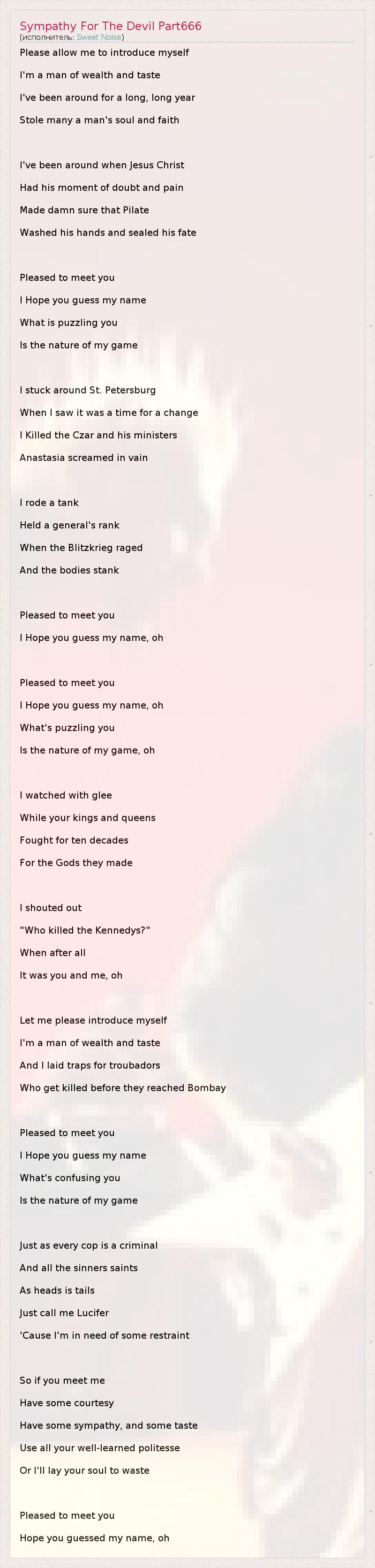 Please allow me to introduce myself I'm a man of wealth and taste I've been around for a long, long year Stole many a man's soul and faith I've been around when Jesus Christ Had his moment of doubt and pain Made damn sure that Pilate Washed his hands and sealed his fate Pleased to meet you I Hope you guess my name What is puzzling you Is the nature of my game I stuck around St. Petersburg When I saw it was a time for a change I Killed the Czar and his ministers Anastasia screamed in vain I rode a tank Held a general's rank When the Blitzkrieg raged And the bodies stank Pleased to meet you I Hope you guess my name, oh Pleased to meet you I Hope you guess my name, oh What's puzzling you Is the nature of my game, oh I watched with glee While your kings and queens Fought for ten decades For the Gods they made I shouted out "Who killed the Kennedys?" When after all It was you and me, oh Let me please introduce myself I'm a man of wealth and taste And I laid traps for troubadors Who get killed before they reached Bombay Pleased to meet you I Hope you guess my name What's confusing you Is the nature of my game Just as every cop is a criminal And all the sinners saints As heads is tails Just call me Lucifer 'Cause I'm in need of some restraint So if you meet me Have some courtesy Have some sympathy, and some taste Use all your well-learned politesse Or I'll lay your soul to waste Pleased to meet you Hope you guessed my name, oh