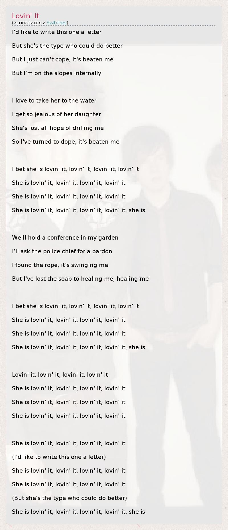 I'd like to write this one a letter But she's the type who could do better But I just can't cope, it's beaten me But I'm on the slopes internally I love to take her to the water I get so jealous of her daughter She's lost all hope of drilling me So I've turned to dope, it's beaten me I bet she is lovin' it, lovin' it, lovin' it, lovin' it She is lovin' it, lovin' it, lovin' it, lovin' it She is lovin' it, lovin' it, lovin' it, lovin' it She is lovin' it, lovin' it, lovin' it, lovin' it, she is We'll hold a conference in my garden I'll ask the police chief for a pardon I found the rope, it's swinging me But I've lost the soap to healing me, healing me I bet she is lovin' it, lovin' it, lovin' it, lovin' it She is lovin' it, lovin' it, lovin' it, lovin' it She is lovin' it, lovin' it, lovin' it, lovin' it She is lovin' it, lovin' it, lovin' it, lovin' it, she is Lovin' it, lovin' it, lovin' it, lovin' it She is lovin' it, lovin' it, lovin' it, lovin' it She is lovin' it, lovin' it, lovin' it, lovin' it She is lovin' it, lovin' it, lovin' it, lovin' it She is lovin' it, lovin' it, lovin' it, lovin' it (I'd like to write this one a letter) She is lovin' it, lovin' it, lovin' it, lovin' it She is lovin' it, lovin' it, lovin' it, lovin' it (But she's the type who could do better) She is lovin' it, lovin' it, lovin' it, lovin' it, she is
