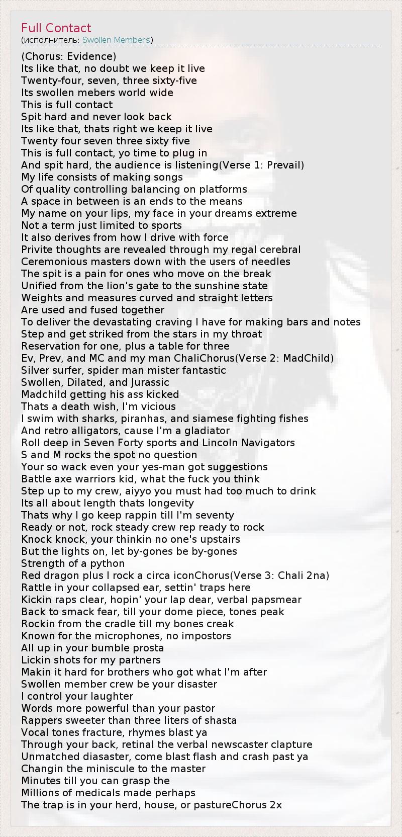 Это интересно:Swollen Members (Своллэн Мэмберс) - канадская хип-хоп группа из города Ванкувер, Британская Колумбия, состоящая в основном из дуэта Madchild и Prevail. Часто, в состав группы включают вокалиста Moka Only (который был фактически членом группы в течение короткого периода времени в 90-х годах, а затем в 2002-2005 годах) и продюсера Rob The Viking,... продолжение