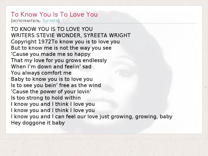 TO KNOW YOU IS TO LOVE YOU WRITERS STEVIE WONDER, SYREETA WRIGHT Copyright 1972To know you is to love you But to know me is not the way you see 'Cause you made me so happy That my love for you grows endlessly When I'm down and feelin' sad You always comfort me Baby to know you is to love you Is to see you bein' free as the wind 'Cause the power of your lovin' Is too strong to hold within I know you and I think I love you I know you and I think I love you I know you and I can feel our love just growing, growing, baby Hey doggone it baby