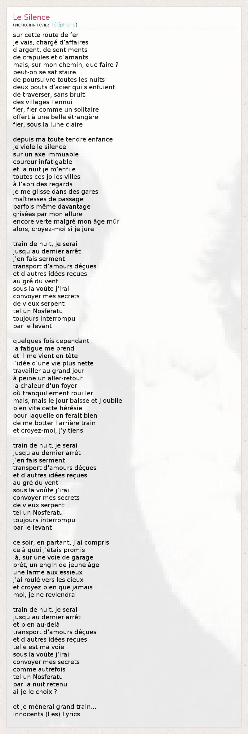 sur cette route de fer je vais, chargé d'affaires d'argent, de sentiments de crapules et d'amants mais, sur mon chemin, que faire ? peut-on se satisfaire de poursuivre toutes les nuits deux bouts d'acier qui s'enfuient de traverser, sans bruit des villages l'ennui fier, fier comme un solitaire offert à une belle étrangère fier, sous la lune claire depuis ma toute tendre enfance je viole le silence sur un axe immuable coureur infatigable et la nuit je m'enfile toutes ces jolies villes à l'abri des regards je me glisse dans des gares maîtresses de passage parfois même davantage grisées par mon allure encore verte malgré mon âge mûr alors, croyez-moi si je jure train de nuit, je serai jusqu'au dernier arrêt j'en fais serment transport d'amours déçues et d'autres idées reçues au gré du vent sous la voûte j'irai convoyer mes secrets de vieux serpent tel un Nosferatu toujours interrompu par le levant quelques fois cependant la fatigue me prend et il me vient en tête l'idée d'une vie plus nette travailler au grand jour à peine un aller-retour la chaleur d'un foyer où tranquillement rouiller mais, mais le jour baisse et j'oublie bien vite cette hérésie pour laquelle on ferait bien de me botter l'arrière train et croyez-moi, j'y tiens train de nuit, je serai jusqu'au dernier arrêt j'en fais serment transport d'amours déçues et d'autres idées reçues au gré du vent sous la voûte j'irai convoyer mes secrets de vieux serpent tel un Nosferatu toujours interrompu par le levant ce soir, en partant, j'ai compris ce à quoi j'étais promis là, sur une voie de garage prêt, un engin de jeune âge une larme aux essieux j'ai roulé vers les cieux et croyez bien que jamais moi, je ne reviendrai train de nuit, je serai jusqu'au dernier arrêt et bien au-delà transport d'amours déçues et d'autres idées reçues telle est ma voie sous la voûte j'irai convoyer mes secrets comme autrefois tel un Nosferatu par la nuit retenu ai-je le choix ? et je mènerai grand train... Innocents (Les) Lyrics