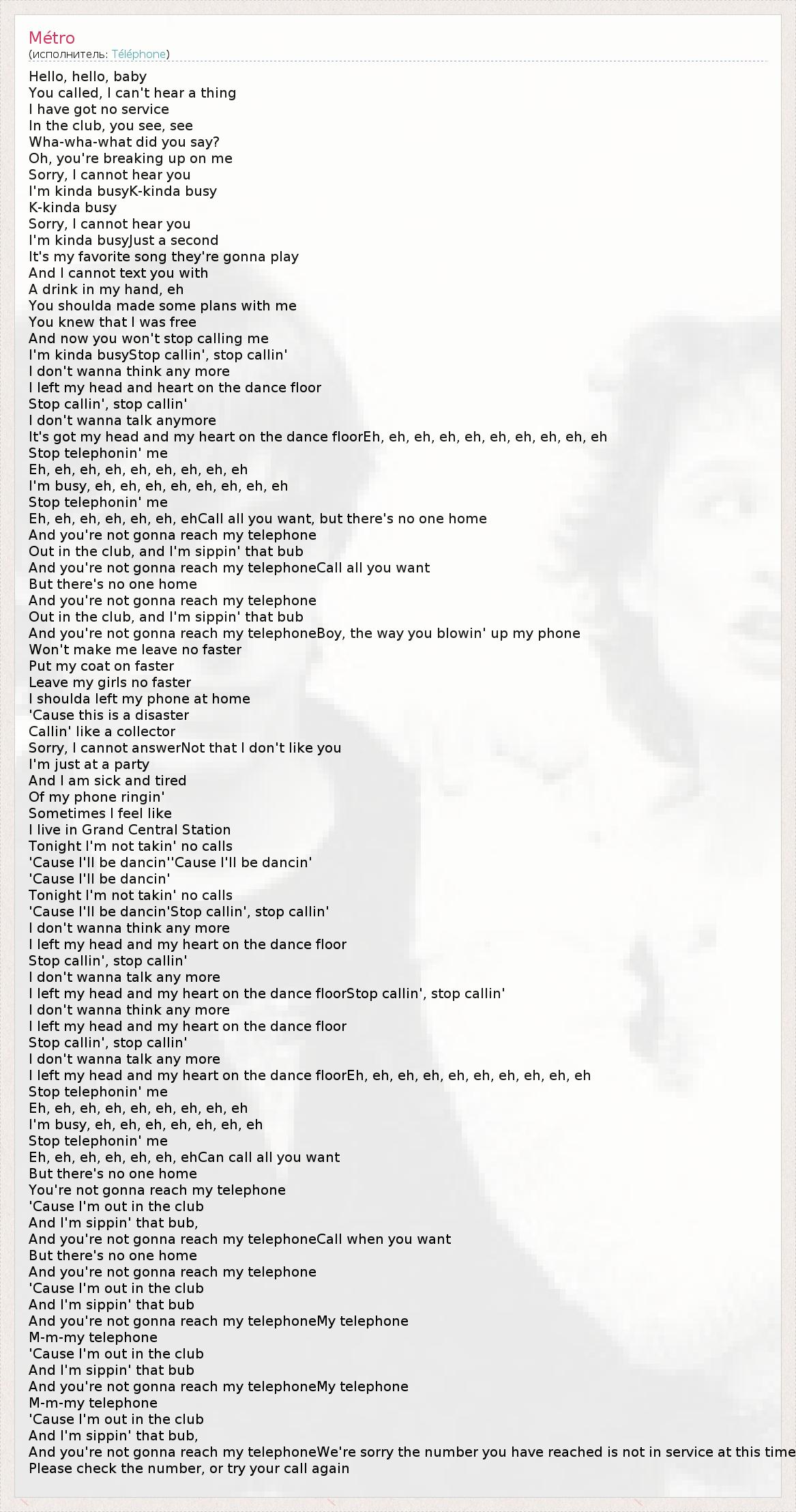 Hello, hello, baby You called, I can't hear a thing I have got no service In the club, you see, see Wha-wha-what did you say? Oh, you're breaking up on me Sorry, I cannot hear you I'm kinda busyK-kinda busy K-kinda busy Sorry, I cannot hear you I'm kinda busyJust a second It's my favorite song they're gonna play And I cannot text you with A drink in my hand, eh You shoulda made some plans with me You knew that I was free And now you won't stop calling me I'm kinda busyStop callin', stop callin' I don't wanna think any more I left my head and heart on the dance floor Stop callin', stop callin' I don't wanna talk anymore It's got my head and my heart on the dance floorEh, eh, eh, eh, eh, eh, eh, eh, eh, eh Stop telephonin' me Eh, eh, eh, eh, eh, eh, eh, eh, eh I'm busy, eh, eh, eh, eh, eh, eh, eh, eh Stop telephonin' me Eh, eh, eh, eh, eh, eh, ehCall all you want, but there's no one home And you're not gonna reach my telephone Out in the club, and I'm sippin' that bub And you're not gonna reach my telephoneCall all you want But there's no one home And you're not gonna reach my telephone Out in the club, and I'm sippin' that bub And you're not gonna reach my telephoneBoy, the way you blowin' up my phone Won't make me leave no faster Put my coat on faster Leave my girls no faster I shoulda left my phone at home 'Cause this is a disaster Callin' like a collector Sorry, I cannot answerNot that I don't like you I'm just at a party And I am sick and tired Of my phone ringin' Sometimes I feel like I live in Grand Central Station Tonight I'm not takin' no calls 'Cause I'll be dancin''Cause I'll be dancin' 'Cause I'll be dancin' Tonight I'm not takin' no calls 'Cause I'll be dancin'Stop callin', stop callin' I don't wanna think any more I left my head and my heart on the dance floor Stop callin', stop callin' I don't wanna talk any more I left my head and my heart on the dance floorStop callin', stop callin' I don't wanna think any more I left my head and my heart on the dance floor Stop callin', stop callin' I don't wanna talk any more I left my head and my heart on the dance floorEh, eh, eh, eh, eh, eh, eh, eh, eh, eh Stop telephonin' me Eh, eh, eh, eh, eh, eh, eh, eh, eh I'm busy, eh, eh, eh, eh, eh, eh, eh Stop telephonin' me Eh, eh, eh, eh, eh, eh, ehCan call all you want But there's no one home You're not gonna reach my telephone 'Cause I'm out in the club And I'm sippin' that bub, And you're not gonna reach my telephoneCall when you want But there's no one home And you're not gonna reach my telephone 'Cause I'm out in the club And I'm sippin' that bub And you're not gonna reach my telephoneMy telephone M-m-my telephone 'Cause I'm out in the club And I'm sippin' that bub And you're not gonna reach my telephoneMy telephone M-m-my telephone 'Cause I'm out in the club And I'm sippin' that bub, And you're not gonna reach my telephoneWe're sorry the number you have reached is not in service at this time Please check the number, or try your call again