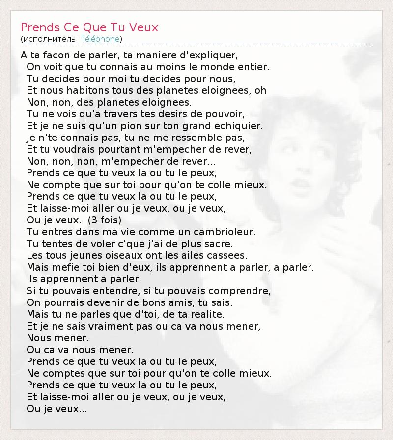 А как ты думаешь, о чем песня "Prends Ce Que Tu Veux" ?