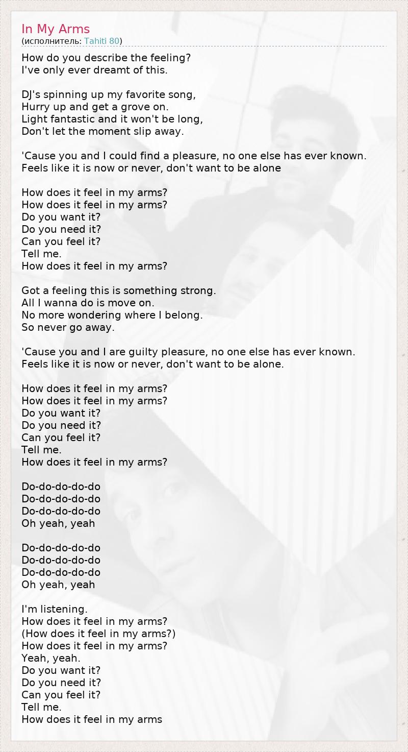 How do you describe the feeling? I've only ever dreamt of this. DJ's spinning up my favorite song, Hurry up and get a grove on. Light fantastic and it won't be long, Don't let the moment slip away. 'Cause you and I could find a pleasure, no one else has ever known. Feels like it is now or never, don't want to be alone How does it feel in my arms? How does it feel in my arms? Do you want it? Do you need it? Can you feel it? Tell me. How does it feel in my arms? Got a feeling this is something strong. All I wanna do is move on. No more wondering where I belong. So never go away. 'Cause you and I are guilty pleasure, no one else has ever known. Feels like it is now or never, don't want to be alone. How does it feel in my arms? How does it feel in my arms? Do you want it? Do you need it? Can you feel it? Tell me. How does it feel in my arms? Do-do-do-do-do Do-do-do-do-do Do-do-do-do-do Oh yeah, yeah Do-do-do-do-do Do-do-do-do-do Do-do-do-do-do Oh yeah, yeah I'm listening. How does it feel in my arms? (How does it feel in my arms?) How does it feel in my arms? Yeah, yeah. Do you want it? Do you need it? Can you feel it? Tell me. How does it feel in my arms