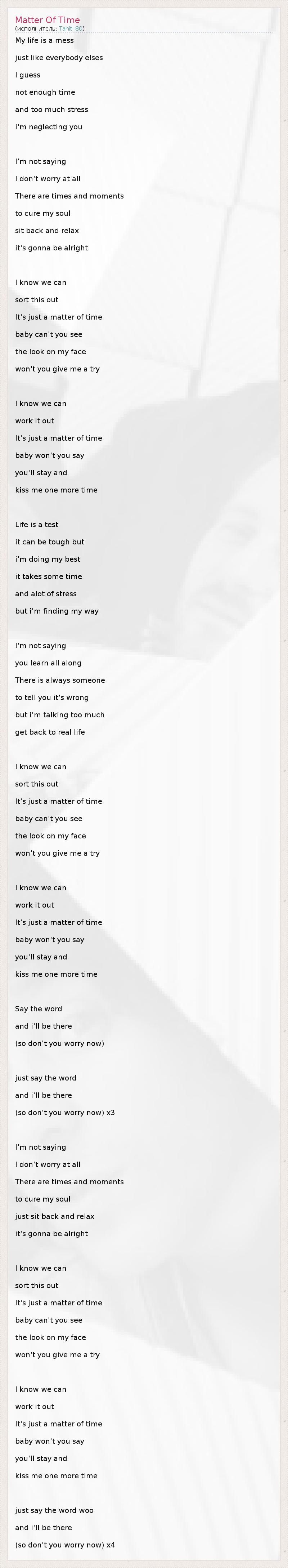 My life is a mess just like everybody elses I guess not enough time and too much stress i'm neglecting you I'm not saying I don't worry at all There are times and moments to cure my soul sit back and relax it's gonna be alright I know we can sort this out It's just a matter of time baby can't you see the look on my face won't you give me a try I know we can work it out It's just a matter of time baby won't you say you'll stay and kiss me one more time Life is a test it can be tough but i'm doing my best it takes some time and alot of stress but i'm finding my way I'm not saying you learn all along There is always someone to tell you it's wrong but i'm talking too much get back to real life I know we can sort this out It's just a matter of time baby can't you see the look on my face won't you give me a try I know we can work it out It's just a matter of time baby won't you say you'll stay and kiss me one more time Say the word and i'll be there (so don't you worry now) just say the word and i'll be there (so don't you worry now) x3 I'm not saying I don't worry at all There are times and moments to cure my soul just sit back and relax it's gonna be alright I know we can sort this out It's just a matter of time baby can't you see the look on my face won't you give me a try I know we can work it out It's just a matter of time baby won't you say you'll stay and kiss me one more time just say the word woo and i'll be there (so don't you worry now) x4
