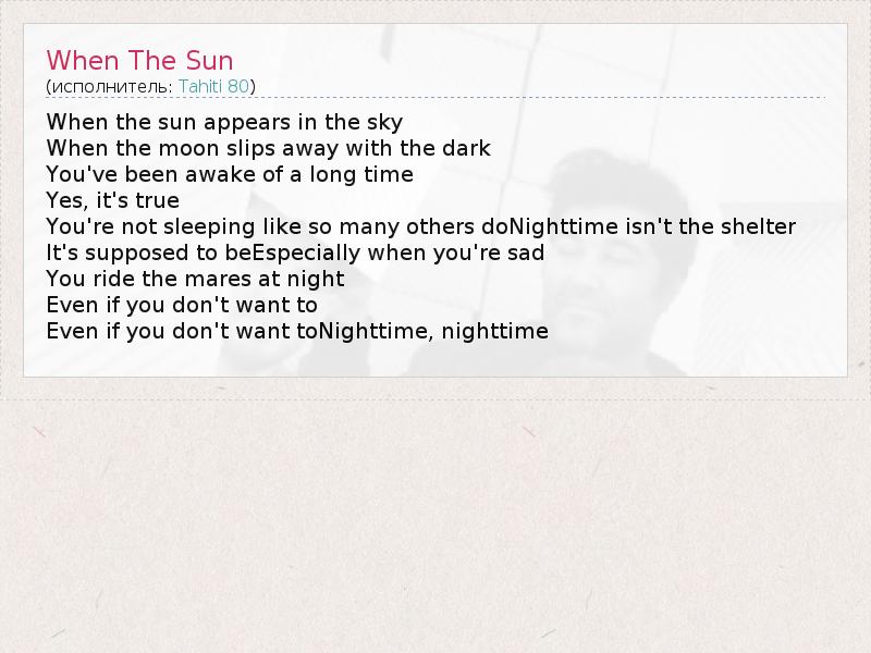 When the sun appears in the sky When the moon slips away with the dark You've been awake of a long time Yes, it's true You're not sleeping like so many others doNighttime isn't the shelter It's supposed to beEspecially when you're sad You ride the mares at night Even if you don't want to Even if you don't want toNighttime, nighttime