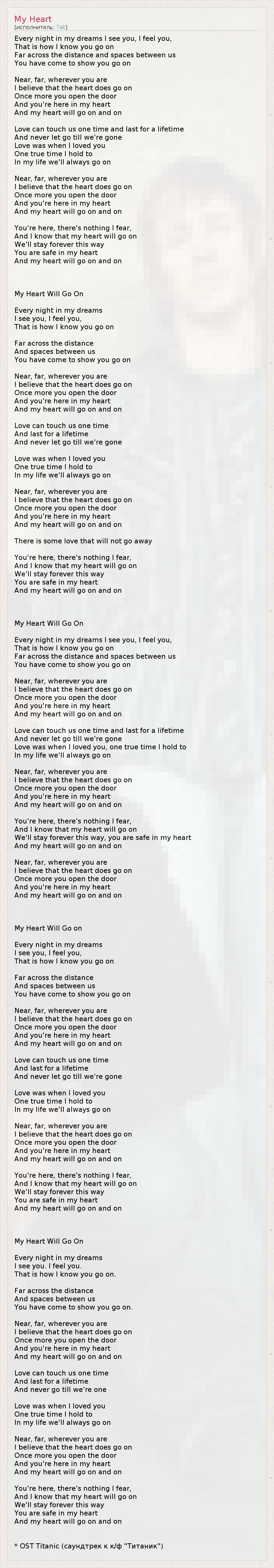 Every night in my dreams I see you, I feel you, That is how I know you go on Far across the distance and spaces between us You have come to show you go on Near, far, wherever you are I believe that the heart does go on Once more you open the door And you're here in my heart And my heart will go on and on Love can touch us one time and last for a lifetime And never let go till we're gone Love was when I loved you One true time I hold to In my life we'll always go on Near, far, wherever you are I believe that the heart does go on Once more you open the door And you're here in my heart And my heart will go on and on You're here, there's nothing I fear, And I know that my heart will go on We'll stay forever this way You are safe in my heart And my heart will go on and on My Heart Will Go On Every night in my dreams I see you, I feel you, That is how I know you go on Far across the distance And spaces between us You have come to show you go on Near, far, wherever you are I believe that the heart does go on Once more you open the door And you're here in my heart And my heart will go on and on Love can touch us one time And last for a lifetime And never let go till we're gone Love was when I loved you One true time I hold to In my life we'll always go on Near, far, wherever you are I believe that the heart does go on Once more you open the door And you're here in my heart And my heart will go on and on There is some love that will not go away You're here, there's nothing I fear, And I know that my heart will go on We'll stay forever this way You are safe in my heart And my heart will go on and on My Heart Will Go On Every night in my dreams I see you, I feel you, That is how I know you go on Far across the distance and spaces between us You have come to show you go on Near, far, wherever you are I believe that the heart does go on Once more you open the door And you're here in my heart And my heart will go on and on Love can touch us one time and last for a lifetime And never let go till we're gone Love was when I loved you, one true time I hold to In my life we'll always go on Near, far, wherever you are I believe that the heart does go on Once more you open the door And you're here in my heart And my heart will go on and on You're here, there's nothing I fear, And I know that my heart will go on We'll stay forever this way, you are safe in my heart And my heart will go on and on Near, far, wherever you are I believe that the heart does go on Once more you open the door And you're here in my heart And my heart will go on and on My Heart Will Go on Every night in my dreams I see you, I feel you, That is how I know you go on Far across the distance And spaces between us You have come to show you go on Near, far, wherever you are I believe that the heart does go on Once more you open the door And you're here in my heart And my heart will go on and on Love can touch us one time And last for a lifetime And never let go till we're gone Love was when I loved you One true time I hold to In my life we'll always go on Near, far, wherever you are I believe that the heart does go on Once more you open the door And you're here in my heart And my heart will go on and on You're here, there's nothing I fear, And I know that my heart will go on We'll stay forever this way You are safe in my heart And my heart will go on and on My Heart Will Go On Every night in my dreams I see you. I feel you. That is how I know you go on. Far across the distance And spaces between us You have come to show you go on. Near, far, wherever you are I believe that the heart does go on Once more you open the door And you're here in my heart And my heart will go on and on Love can touch us one time And last for a lifetime And never go till we're one Love was when I loved you One true time I hold to In my life we'll always go on Near, far, wherever you are I believe that the heart does go on Once more you open the door And you're here in my heart And my heart will go on and on You're here, there's nothing I fear, And I know that my heart will go on We'll stay forever this way You are safe in my heart And my heart will go on and on * OST Titanic (саундтрек к к/ф "Титаник")