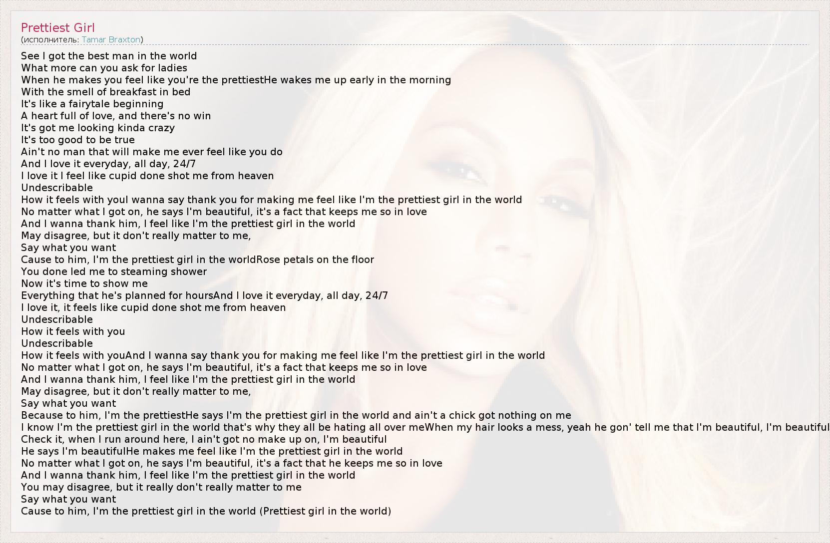 See I got the best man in the world What more can you ask for ladies When he makes you feel like you're the prettiestHe wakes me up early in the morning With the smell of breakfast in bed It's like a fairytale beginning A heart full of love, and there's no win It's got me looking kinda crazy It's too good to be true Ain't no man that will make me ever feel like you do And I love it everyday, all day, 24/7 I love it I feel like cupid done shot me from heaven Undescribable How it feels with youI wanna say thank you for making me feel like I'm the prettiest girl in the world No matter what I got on, he says I'm beautiful, it's a fact that keeps me so in love And I wanna thank him, I feel like I'm the prettiest girl in the world May disagree, but it don't really matter to me, Say what you want Cause to him, I'm the prettiest girl in the worldRose petals on the floor You done led me to steaming shower Now it's time to show me Everything that he's planned for hoursAnd I love it everyday, all day, 24/7 I love it, it feels like cupid done shot me from heaven Undescribable How it feels with you Undescribable How it feels with youAnd I wanna say thank you for making me feel like I'm the prettiest girl in the world No matter what I got on, he says I'm beautiful, it's a fact that keeps me so in love And I wanna thank him, I feel like I'm the prettiest girl in the world May disagree, but it don't really matter to me, Say what you want Because to him, I'm the prettiestHe says I'm the prettiest girl in the world and ain't a chick got nothing on me I know I'm the prettiest girl in the world that's why they all be hating all over meWhen my hair looks a mess, yeah he gon' tell me that I'm beautiful, I'm beautiful Check it, when I run around here, I ain't got no make up on, I'm beautiful He says I'm beautifulHe makes me feel like I'm the prettiest girl in the world No matter what I got on, he says I'm beautiful, it's a fact that he keeps me so in love And I wanna thank him, I feel like I'm the prettiest girl in the world You may disagree, but it really don't really matter to me Say what you want Cause to him, I'm the prettiest girl in the world (Prettiest girl in the world)