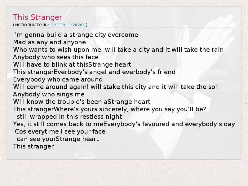I'm gonna build a strange city overcome Mad as any and anyone Who wants to wish upon meI will take a city and it will take the rain Anybody who sees this face Will have to blink at thisStrange heart This strangerEverbody's angel and everbody's friend Everybody who came around Will come around againI will stake this city and it will take the soil Anybody who sings me Will know the trouble's been aStrange heart This strangerWhere's yours sincerely, where you say you'll be? I still wrapped in this restless night Yes, it still comes back to meEverybody's favoured and everybody's day 'Cos everytime I see your face I can see yourStrange heart This stranger