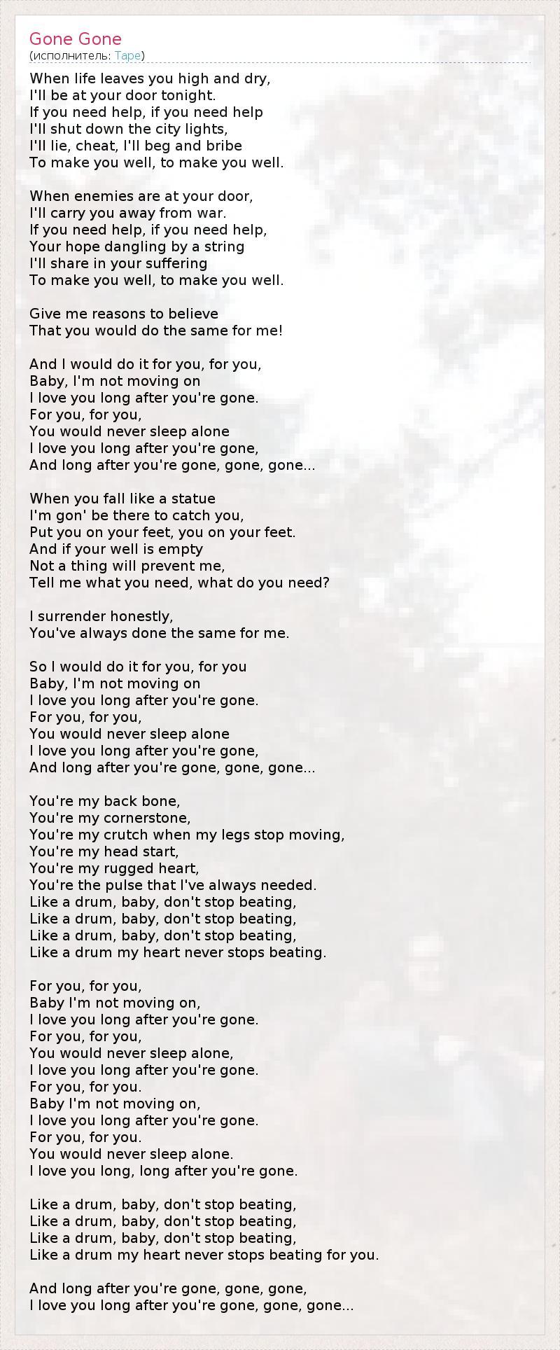 When life leaves you high and dry, I'll be at your door tonight. If you need help, if you need help I'll shut down the city lights, I'll lie, cheat, I'll beg and bribe To make you well, to make you well. When enemies are at your door, I'll carry you away from war. If you need help, if you need help, Your hope dangling by a string I'll share in your suffering To make you well, to make you well. Give me reasons to believe That you would do the same for me! And I would do it for you, for you, Baby, I'm not moving on I love you long after you're gone. For you, for you, You would never sleep alone I love you long after you're gone, And long after you're gone, gone, gone... When you fall like a statue I'm gon' be there to catch you, Put you on your feet, you on your feet. And if your well is empty Not a thing will prevent me, Tell me what you need, what do you need? I surrender honestly, You've always done the same for me. So I would do it for you, for you Baby, I'm not moving on I love you long after you're gone. For you, for you, You would never sleep alone I love you long after you're gone, And long after you're gone, gone, gone... You're my back bone, You're my cornerstone, You're my crutch when my legs stop moving, You're my head start, You're my rugged heart, You're the pulse that I've always needed. Like a drum, baby, don't stop beating, Like a drum, baby, don't stop beating, Like a drum, baby, don't stop beating, Like a drum my heart never stops beating. For you, for you, Baby I'm not moving on, I love you long after you're gone. For you, for you, You would never sleep alone, I love you long after you're gone. For you, for you. Baby I'm not moving on, I love you long after you're gone. For you, for you. You would never sleep alone. I love you long, long after you're gone. Like a drum, baby, don't stop beating, Like a drum, baby, don't stop beating, Like a drum, baby, don't stop beating, Like a drum my heart never stops beating for you. And long after you're gone, gone, gone, I love you long after you're gone, gone, gone...