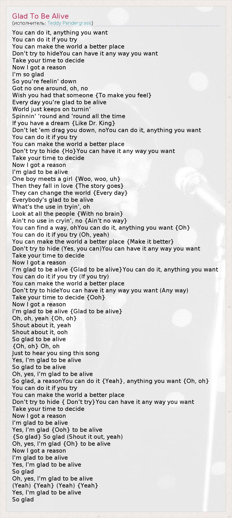 I'm glad to be alive {Glad to be alive}You can do it, anything you want