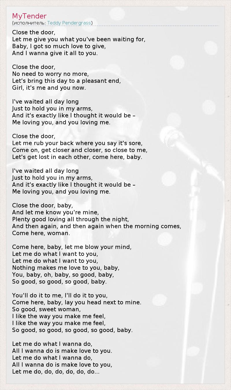 Закрой дверь, Позволь мне подарить тебе то, чего ты ждёшь, Детка, во мне столько любви, И я хочу отдать её всю тебе. Закрой дверь, Больше не нужно волноваться, Давай подведём этот день к приятному концу, Девочка, сейчас есть только ты и я. Я ждал весь день, Чтобы заключить тебя в объятия, И всё именно так, как я и представлял, Я буду любить тебя, а ты будешь любить меня. Закрой дверь, Давай я разотру тебе спину, где она ноет, Ну же, подойди ближе, ближе, совсем близко ко мне, Давай растворимся друг в друге, иди сюда, детка. Я ждал весь день, Чтобы заключить тебя в объятия, И всё именно так, как я и представлял, Я буду любить тебя, а ты будешь любить меня. Закрой дверь, детка, И покажи, что ты моя. Много нежной любви всю ночь, А после опять и опять, когда наступит утро, Иди сюда, женщина. Иди сюда, детка, позволь мне свести тебя с ума, Позволь мне делать с тобой то, что я хочу, Позволь мне делать с тобой то, что я хочу, Ничто не принуждает меня любить тебя, детка, Только ты сама, детка, о, детка, так хорошо, детка, Так хорошо, так хорошо, так приятно, детка. Ты займёшься этим со мной, я займусь этим с тобой, Иди сюда, детка, пристраивай свою голову рядом с моей, Так приятно, красавица, Мне нравится, какие чувства ты будишь во мне, Мне нравится, какие чувства ты будишь во мне, Так хорошо, так хорошо, так приятно, так приятно детка. Позволь мне делать то, что я хочу, А хочу я лишь заниматься любовью с тобой. Позволь мне делать то, что я хочу, А хочу я лишь заниматься любовью с тобой. Позволь мне заняться, заняться, заняться, заняться, заняться...