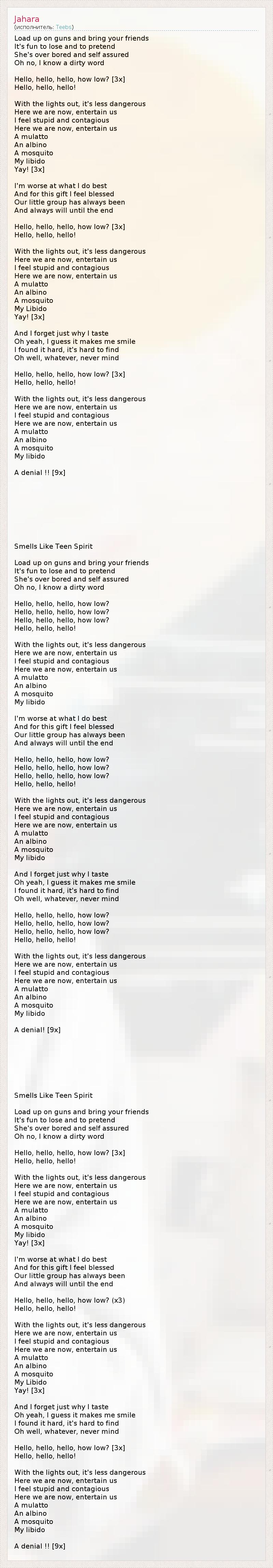 Load up on guns and bring your friends It's fun to lose and to pretend She's over bored and self assured Oh no, I know a dirty word Hello, hello, hello, how low? [3x] Hello, hello, hello! With the lights out, it's less dangerous Here we are now, entertain us I feel stupid and contagious Here we are now, entertain us A mulatto An albino A mosquito My libido Yay! [3x] I'm worse at what I do best And for this gift I feel blessed Our little group has always been And always will until the end Hello, hello, hello, how low? [3x] Hello, hello, hello! With the lights out, it's less dangerous Here we are now, entertain us I feel stupid and contagious Here we are now, entertain us A mulatto An albino A mosquito My Libido Yay! [3x] And I forget just why I taste Oh yeah, I guess it makes me smile I found it hard, it's hard to find Oh well, whatever, never mind Hello, hello, hello, how low? [3x] Hello, hello, hello! With the lights out, it's less dangerous Here we are now, entertain us I feel stupid and contagious Here we are now, entertain us A mulatto An albino A mosquito My libido A denial !! [9x] Smells Like Teen Spirit Load up on guns and bring your friends It's fun to lose and to pretend She's over bored and self assured Oh no, I know a dirty word Hello, hello, hello, how low? Hello, hello, hello, how low? Hello, hello, hello, how low? Hello, hello, hello! With the lights out, it's less dangerous Here we are now, entertain us I feel stupid and contagious Here we are now, entertain us A mulatto An albino A mosquito My libido I'm worse at what I do best And for this gift I feel blessed Our little group has always been And always will until the end Hello, hello, hello, how low? Hello, hello, hello, how low? Hello, hello, hello, how low? Hello, hello, hello! With the lights out, it's less dangerous Here we are now, entertain us I feel stupid and contagious Here we are now, entertain us A mulatto An albino A mosquito My libido And I forget just why I taste Oh yeah, I guess it makes me smile I found it hard, it's hard to find Oh well, whatever, never mind Hello, hello, hello, how low? Hello, hello, hello, how low? Hello, hello, hello, how low? Hello, hello, hello! With the lights out, it's less dangerous Here we are now, entertain us I feel stupid and contagious Here we are now, entertain us A mulatto An albino A mosquito My libido A denial! [9x] Smells Like Teen Spirit Load up on guns and bring your friends It's fun to lose and to pretend She's over bored and self assured Oh no, I know a dirty word Hello, hello, hello, how low? [3x] Hello, hello, hello! With the lights out, it's less dangerous Here we are now, entertain us I feel stupid and contagious Here we are now, entertain us A mulatto An albino A mosquito My libido Yay! [3x] I'm worse at what I do best And for this gift I feel blessed Our little group has always been And always will until the end Hello, hello, hello, how low? (x3) Hello, hello, hello! With the lights out, it's less dangerous Here we are now, entertain us I feel stupid and contagious Here we are now, entertain us A mulatto An albino A mosquito My Libido Yay! [3x] And I forget just why I taste Oh yeah, I guess it makes me smile I found it hard, it's hard to find Oh well, whatever, never mind Hello, hello, hello, how low? [3x] Hello, hello, hello! With the lights out, it's less dangerous Here we are now, entertain us I feel stupid and contagious Here we are now, entertain us A mulatto An albino A mosquito My libido A denial !! [9x]