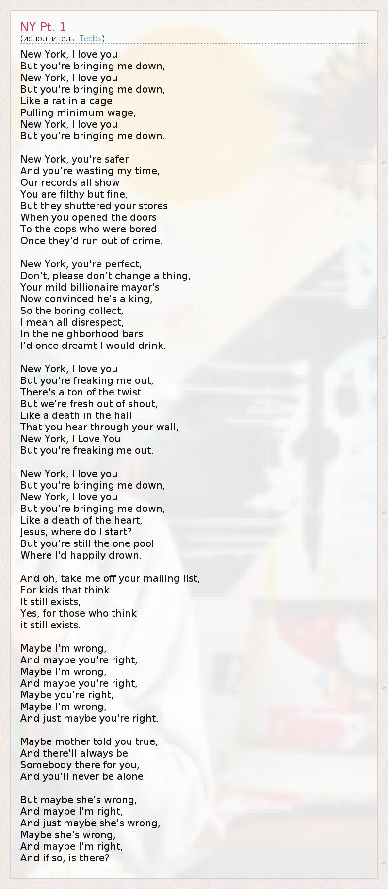 Нью-Йорк, я люблю тебя, Но ты меня угнетаешь, Нью-Йорк, я люблю тебя, Но ты меня угнетаешь, Я словно крыса в клетке, Еле тяну на прожиточный минимум, Нью-Йорк, я люблю тебя, Но ты меня угнетаешь. Нью-Йорк, ты стал безопаснее И тратишь мое время, История свидетельствует: Ты грязный город, но неплохой, Но твои витрины расколотили, Как только ты распахнул двери Копам, которые заскучали От нехватки преступлений. Нью-Йорк, ты безупречен, Нет, прошу, не меняйся совсем, Твой скромный мэр-миллиардер Уже убежден, что он король, И скучные люди собираются - Я правда их презираю - В местных барах, в которых Я когда-то мечтал выпить. Нью-Йорк, я люблю тебя, Но ты меня пугаешь, У нас куча изворотливых хитрецов И нехватка настоящих бунтарей, Словно кто-то умирает в коридоре, А ты слышишь это через стену, Нью-Йорк, я люблю тебя, Но ты меня пугаешь. Нью-Йорк, я люблю тебя, Но ты меня угнетаешь, Нью-Йорк, я люблю тебя, Но ты меня угнетаешь, Словно я умер сердцем, Боже, где же я начинаюсь? Но ты все-таки единственный омут, В котором я бы с радостью утонул. Вычеркни меня из своей адресной книги, Для наивных, которые думают, Что такая еще существует, Да, для тех, кто думает, Что она еще существует. Может, я ошибаюсь, И может, ты прав, Может, я ошибаюсь, И может, ты прав, Может, ты прав, Может, я ошибаюсь, Ты ведь можешь оказаться прав. Может, правду мама говорила, И рядом с тобой Всегда будет кто-то, И ты никогда не будешь один. Но может, она ошибалась, И может, я прав, Она ведь могла ошибаться, Может, она ошибалась, И может, я прав, а если прав, То всегда ли есть тот кто-то?