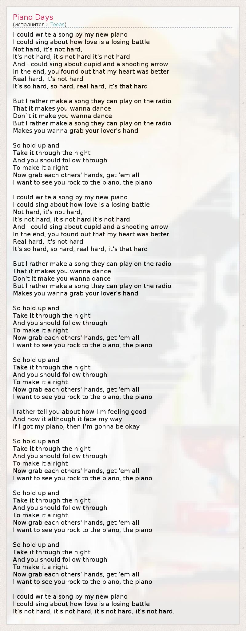Я могла бы написать песню на моём новом рояле, Я спела бы о том, что любовь – битва, в которой не выиграть. Это нетрудно, это нетрудно. Нетрудно, нетрудно, нетрудно. И я спела бы о Купидоне и его стрелах, И, в конце концов, ты понял бы, как просто было раньше моему сердцу. Действительно трудно, это не тяжело. Это так сложно, так сложно, по-настоящему сложно, очень сложно. Но лучше я напишу такую песню, которую можно будет поставить в ротацию, Под которую ты будешь танцевать, Разве ты не хочешь танцевать под неё? Но я напишу такую песню, которую можно будет поставить в эфир, Такую, что заставит тебя взять за руку свою любимую. Так держи крепче На протяжении всей ночи, И ты должен следовать песне, Чтобы все было правильно, Возьмите друг друга за руки, Я хочу увидеть, как ты сыграешь на этом рояле. Я могла бы написать песню на моём новом рояле, Я спела бы о том, что любовь – битва, в которой не выиграть. Это нетрудно, это нетрудно. Нетрудно, нетрудно, нетрудно. И я спела бы о Купидоне и его стрелах, И, в конце концов, ты понял бы, как просто было раньше моему сердцу. Действительно трудно, это не тяжело. Это так сложно, так сложно, по-настоящему сложно, очень сложно. Но лучше я напишу такую песню, которую можно будет поставить в ротацию, Под которую ты будешь танцевать, Разве ты не хочешь танцевать под неё? Но я напишу такую песню, которую можно будет поставить в эфир, Такую, что заставит тебя взять за руку свою любимую. Так держи крепче На протяжении всей ночи, И ты должен следовать песне, Чтобы все было правильно, Возьмите друг друга за руки, Я хочу увидеть, как ты сыграешь на этом рояле. Так держи крепче На протяжении всей ночи, И ты должен следовать песне, Чтобы все было правильно, Возьмите друг друга за руки, Я хочу увидеть, как ты сыграешь на этом рояле. Я лучше расскажу тебе о том, что со мной все хорошо, И через что мне пришлось пройти. И только когда я сяду за свой рояль, только тогда я буду в порядке. Так держи крепче На протяжении всей ночи, И ты должен следовать песне, Чтобы все было правильно, Возьмите друг друга за руки, Я хочу увидеть, как ты сыграешь на этом рояле. Так держи крепче На протяжении всей ночи, И ты должен следовать песне, Чтобы все было правильно, Возьмите друг друга за руки, Я хочу увидеть, как ты сыграешь на этом рояле. Так держи крепче На протяжении всей ночи, И ты должен следовать песне, Чтобы все было правильно, Возьмите друг друга за руки, Я хочу увидеть, как ты сыграешь на этом рояле. Я могла бы написать песню на моём новом рояле, Я спела бы о том, что любовь – битва, в которой не выиграть. Это нетрудно, это нетрудно.