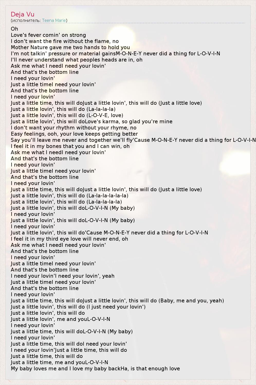 Oh Love's fever comin' on strong I don't want the fire without the flame, no Mother Nature gave me two hands to hold you I'm not talkin' pressure or material gainsM-O-N-E-Y never did a thing for L-O-V-I-N I'll never understand what peoples heads are in, oh Ask me what I needI need your lovin' And that's the bottom line I need your lovin' Just a little timeI need your lovin' And that's the bottom line I need your lovin' Just a little time, this will doJust a little lovin', this will do (Just a little love) Just a little lovin', this will do (La-la-la-la) Just a little lovin', this will do (L-O-V-E, love) Just a little lovin', this will doLove's karma, so glad you're mine I don't want your rhythm without your rhyme, no Easy feelings, ooh, your love keeps getting better Say you'll leave me never and together we'll fly'Cause M-O-N-E-Y never did a thing for L-O-V-I-N I feel it in my bones that you and I can win, oh Ask me what I needI need your lovin' And that's the bottom line I need your lovin' Just a little timeI need your lovin' And that's the bottom line I need your lovin' Just a little time, this will doJust a little lovin', this will do (Just a little love) Just a little lovin', this will do (La-la-la-la-la-la) Just a little lovin', this will do (La-la-la-la-la) Just a little lovin', this will doL-O-V-I-N (My baby) I need your lovin' Just a little lovin', this will doL-O-V-I-N (My baby) I need your lovin' Just a little lovin', this will do'Cause M-O-N-E-Y never did a thing for L-O-V-I-N I feel it in my third eye love will never end, oh Ask me what I needI need your lovin' And that's the bottom line I need your lovin' Just a little timeI need your lovin' And that's the bottom line I need your lovin'I need your lovin', yeah Just a little timeI need your lovin' And that's the bottom line I need your lovin' Just a little time, this will doJust a little lovin', this will do (Baby, me and you, yeah) Just a little lovin', this will do (I just need your lovin') Just a little lovin', this will do Just a little lovin', me and youL-O-V-I-N I need your lovin' Just a little time, this will doL-O-V-I-N (My baby) I need your lovin' Just a little time, this will doI need your lovin' I need your lovin'Just a little time, this will do Just a little time, this will do Just a little time, me and youL-O-V-I-N My baby loves me and I love my baby backHa, is that enough love