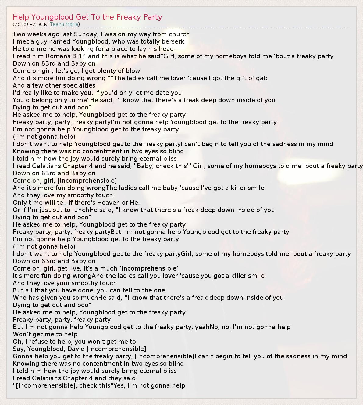 Two weeks ago last Sunday, I was on my way from church I met a guy named Youngblood, who was totally berserk He told me he was looking for a place to lay his head I read him Romans 8:14 and this is what he said"Girl, some of my homeboys told me 'bout a freaky party Down on 63rd and Babylon Come on girl, let's go, I got plenty of blow And it's more fun doing wrong ""The ladies call me lover 'cause I got the gift of gab And a few other specialties I'd really like to make you, if you'd only let me date you You'd belong only to me"He said, "I know that there's a freak deep down inside of you Dying to get out and ooo" He asked me to help, Youngblood get to the freaky party Freaky party, party, freaky partyI'm not gonna help Youngblood get to the freaky party I'm not gonna help Youngblood get to the freaky party (I'm not gonna help) I don't want to help Youngblood get to the freaky partyI can't begin to tell you of the sadness in my mind Knowing there was no contentment in two eyes so blind I told him how the joy would surely bring eternal bliss I read Galatians Chapter 4 and he said, "Baby, check this""Girl, some of my homeboys told me 'bout a freaky party Down on 63rd and Babylon Come on, girl, [Incomprehensible] And it's more fun doing wrongThe ladies call me baby 'cause I've got a killer smile And they love my smoothy touch Only time will tell if there's Heaven or Hell Or if I'm just out to lunchHe said, "I know that there's a freak deep down inside of you Dying to get out and ooo" He asked me to help, Youngblood get to the freaky party Freaky party, party, freaky partyBut I'm not gonna help Youngblood get to the freaky party I'm not gonna help Youngblood get to the freaky party (I'm not gonna help) I don't want to help Youngblood get to the freaky partyGirl, some of my homeboys told me 'bout a freaky party Down on 63rd and Babylon Come on, girl, get live, it's a much [Incomprehensible] It's more fun doing wrongAnd the ladies call you lover 'cause you got a killer smile And they love your smoothy touch But all that you have done, you can tell to the one Who has given you so muchHe said, "I know that there's a freak deep down inside of you Dying to get out and ooo" He asked me to help, Youngblood get to the freaky party Freaky party, party, freaky party But I'm not gonna help Youngblood get to the freaky party, yeahNo, no, I'm not gonna help Won't get me to help Oh, I refuse to help, you won't get me to Say, Youngblood, David [Incomprehensible] Gonna help you get to the freaky party, [Incomprehensible]I can't begin to tell you of the sadness in my mind Knowing there was no contentment in two eyes so blind I told him how the joy would surely bring eternal bliss I read Galatians Chapter 4 and they said "[Incomprehensible], check this"Yes, I'm not gonna help