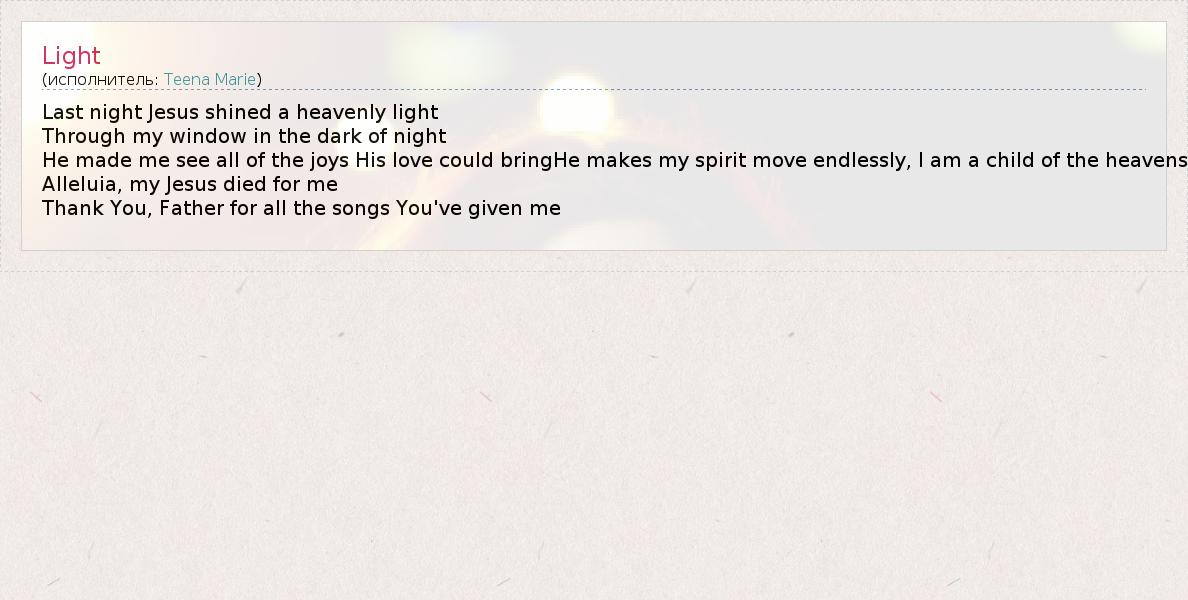 Last night Jesus shined a heavenly light Through my window in the dark of night He made me see all of the joys His love could bringHe makes my spirit move endlessly, I am a child of the heavens Alleluia, my Jesus died for me Thank You, Father for all the songs You've given me