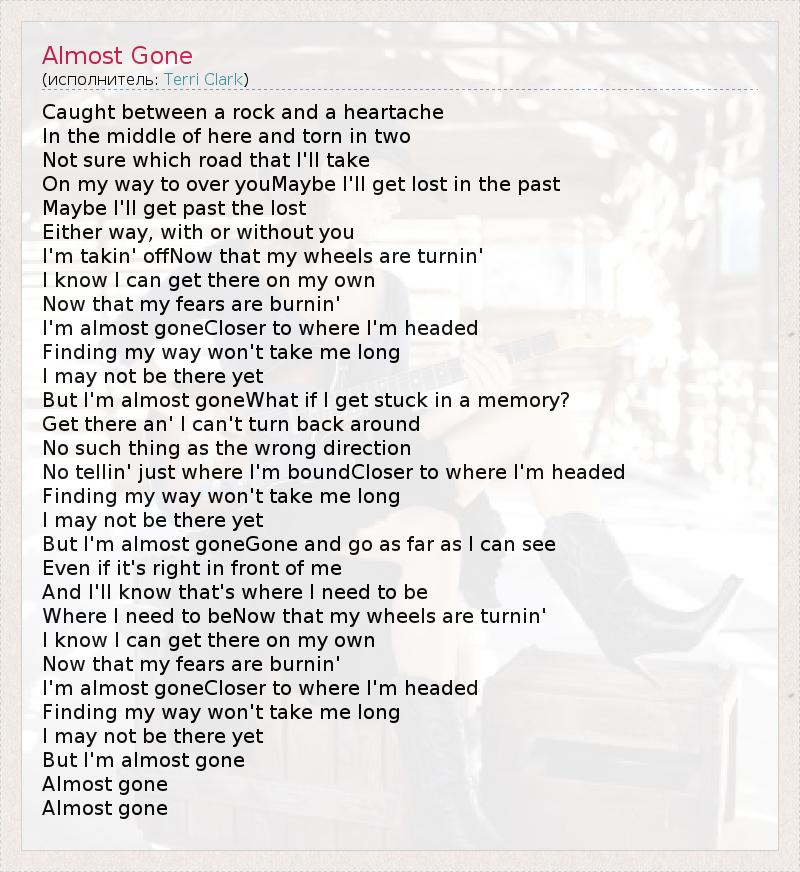 Caught between a rock and a heartache In the middle of here and torn in two Not sure which road that I'll take On my way to over youMaybe I'll get lost in the past Maybe I'll get past the lost Either way, with or without you I'm takin' offNow that my wheels are turnin' I know I can get there on my own Now that my fears are burnin' I'm almost goneCloser to where I'm headed Finding my way won't take me long I may not be there yet But I'm almost goneWhat if I get stuck in a memory? Get there an' I can't turn back around No such thing as the wrong direction No tellin' just where I'm boundCloser to where I'm headed Finding my way won't take me long I may not be there yet But I'm almost goneGone and go as far as I can see Even if it's right in front of me And I'll know that's where I need to be Where I need to beNow that my wheels are turnin' I know I can get there on my own Now that my fears are burnin' I'm almost goneCloser to where I'm headed Finding my way won't take me long I may not be there yet But I'm almost gone Almost gone Almost gone