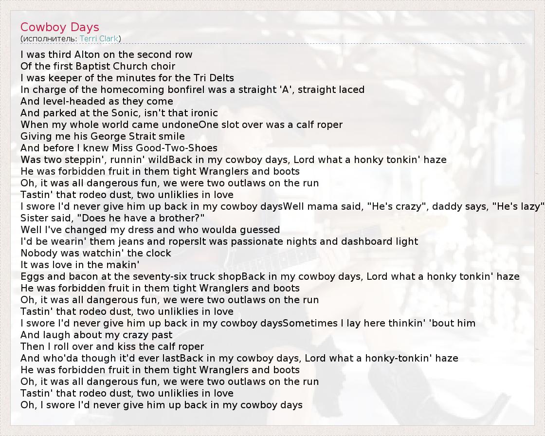 I was third Alton on the second row Of the first Baptist Church choir I was keeper of the minutes for the Tri Delts In charge of the homecoming bonfireI was a straight 'A', straight laced And level-headed as they come And parked at the Sonic, isn't that ironic When my whole world came undoneOne slot over was a calf roper Giving me his George Strait smile And before I knew Miss Good-Two-Shoes Was two steppin', runnin' wildBack in my cowboy days, Lord what a honky tonkin' haze He was forbidden fruit in them tight Wranglers and boots Oh, it was all dangerous fun, we were two outlaws on the run Tastin' that rodeo dust, two unliklies in love I swore I'd never give him up back in my cowboy daysWell mama said, "He's crazy", daddy says, "He's lazy" Sister said, "Does he have a brother?" Well I've changed my dress and who woulda guessed I'd be wearin' them jeans and ropersIt was passionate nights and dashboard light Nobody was watchin' the clock It was love in the makin' Eggs and bacon at the seventy-six truck shopBack in my cowboy days, Lord what a honky tonkin' haze He was forbidden fruit in them tight Wranglers and boots Oh, it was all dangerous fun, we were two outlaws on the run Tastin' that rodeo dust, two unliklies in love I swore I'd never give him up back in my cowboy daysSometimes I lay here thinkin' 'bout him And laugh about my crazy past Then I roll over and kiss the calf roper And who'da though it'd ever lastBack in my cowboy days, Lord what a honky-tonkin' haze He was forbidden fruit in them tight Wranglers and boots Oh, it was all dangerous fun, we were two outlaws on the run Tastin' that rodeo dust, two unliklies in love Oh, I swore I'd never give him up back in my cowboy days